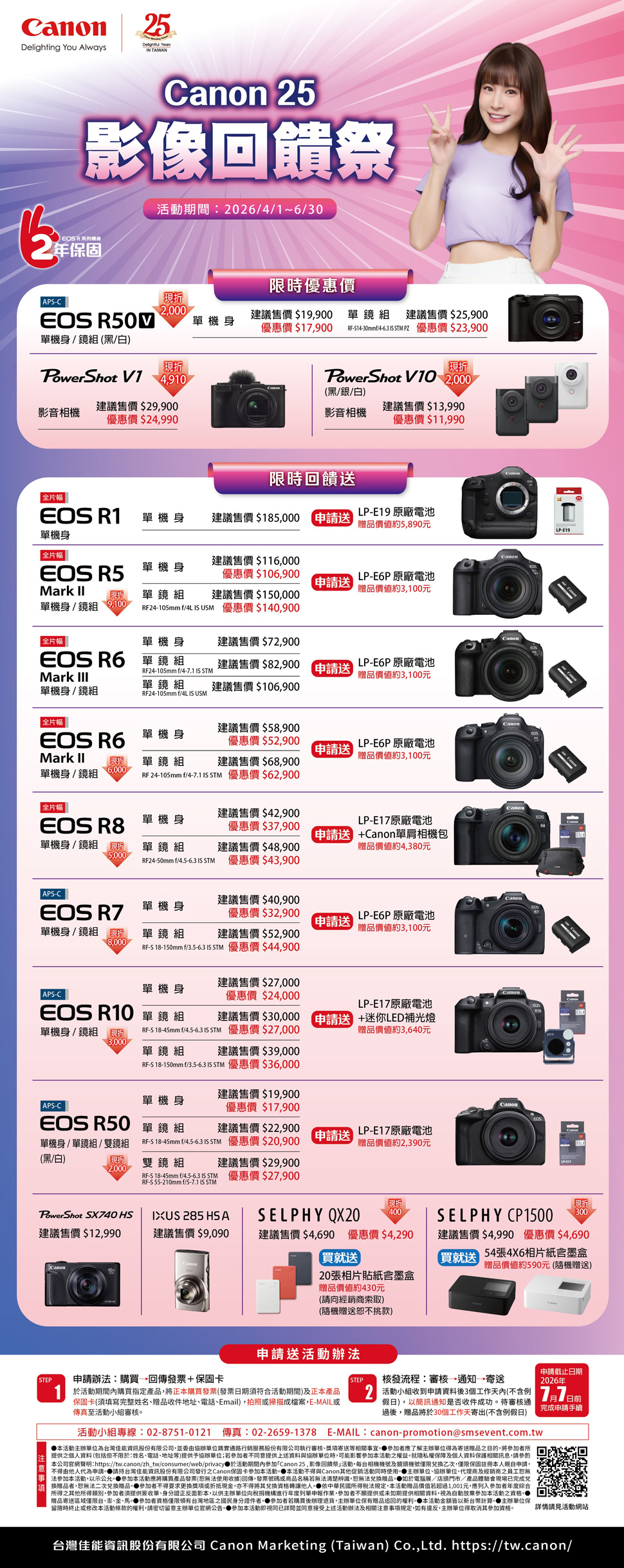 Canon 25 影像回饋祭:《相機篇》 活動時間:2026/4/1-6/30。