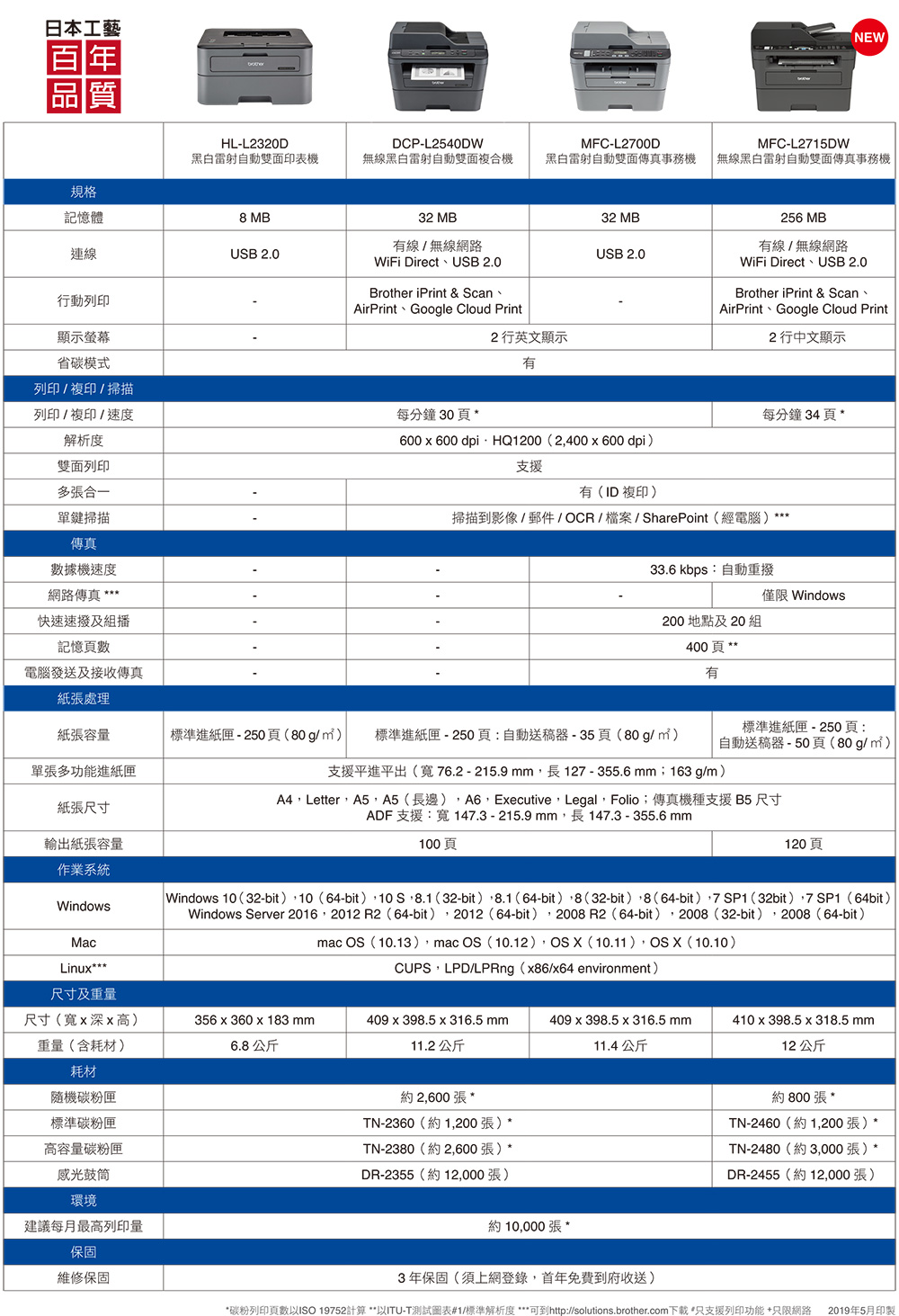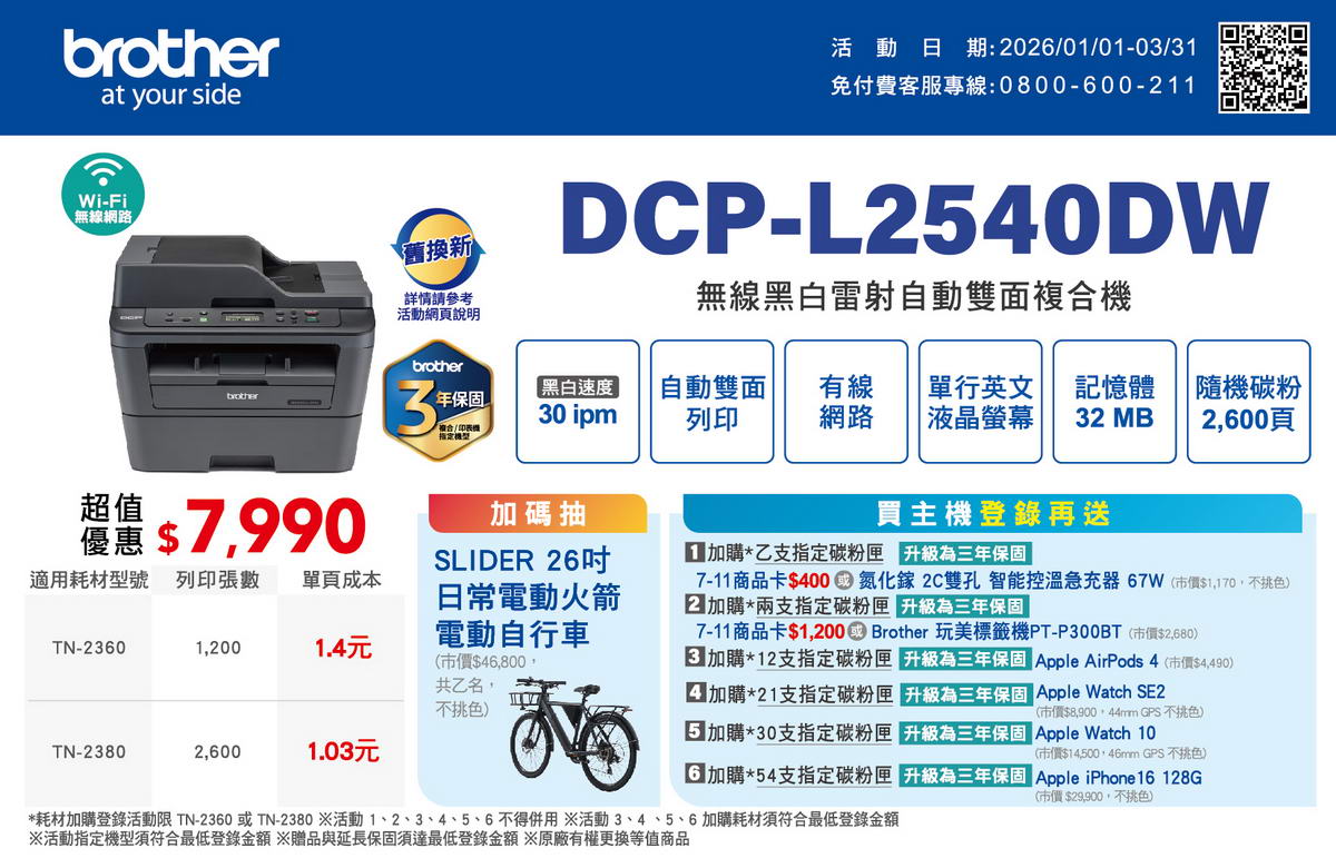 | 保固期 | 自購買日起12個月(提供有效憑證:發票,出貨單,3C連鎖店消費證明)。 相關資訊請參考原廠服務資訊網頁http://www.brother.tw/Service/HowToRepair.aspx |