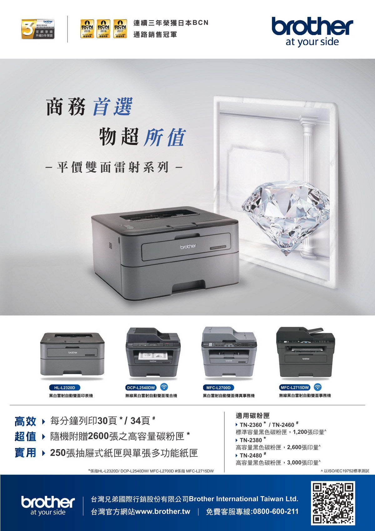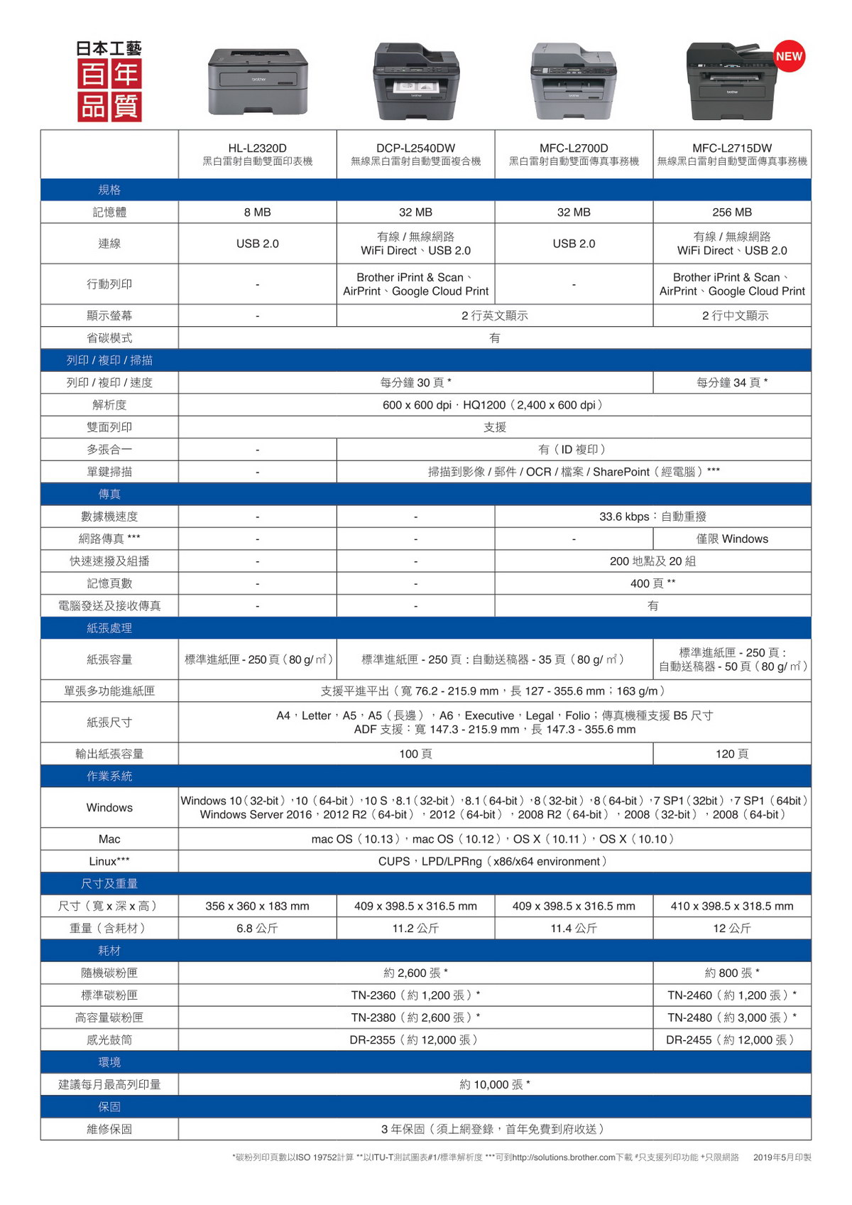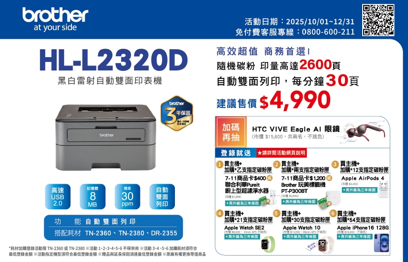| 保固期 | 自購買日起12個月(提供有效憑證:發票,出貨單,3C連鎖店消費證明)。 相關資訊請參考原廠服務資訊網頁http://www.brother.tw/Service/HowToRepair.aspx |