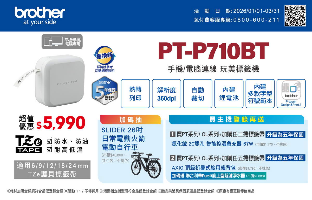 - Brother手機電腦藍芽PT-P710BT