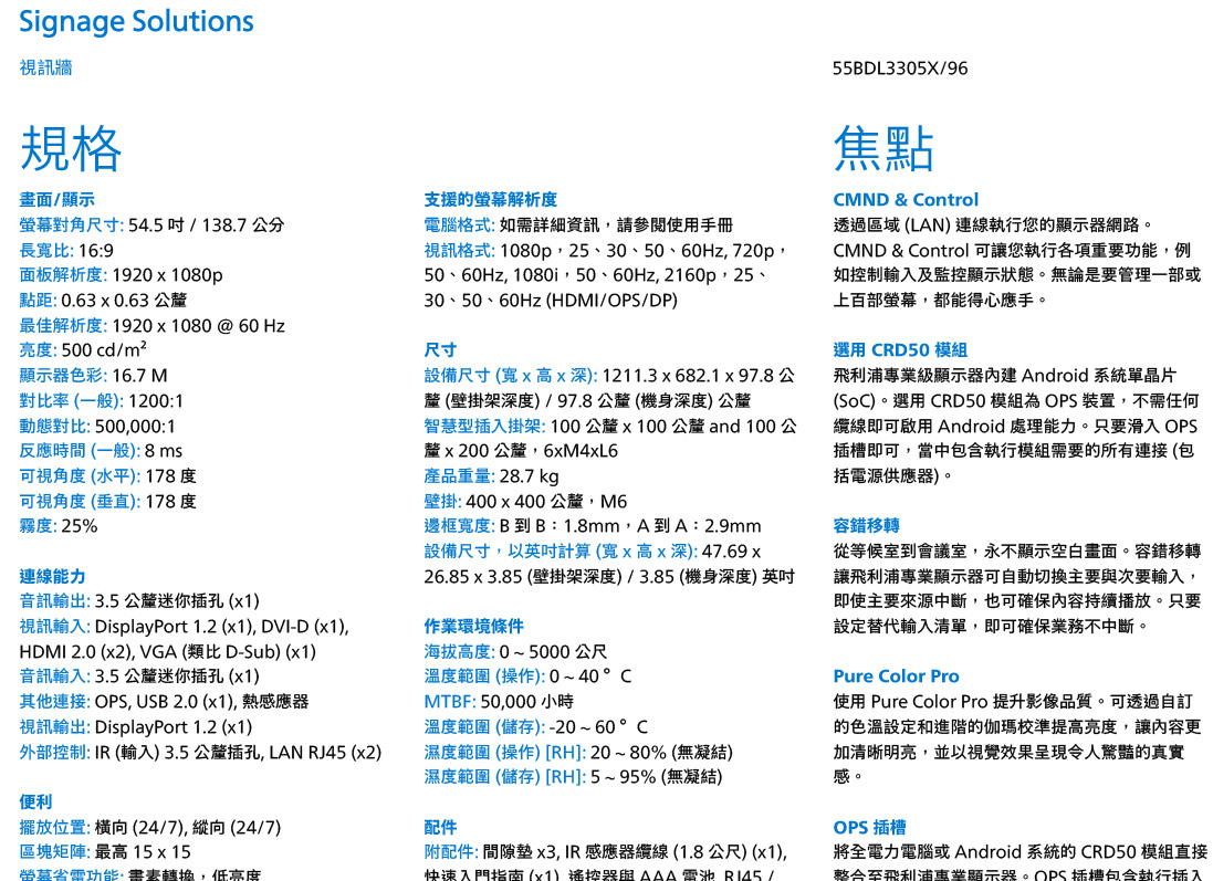 PHILIPS 55BDL3305X 視訊牆顯示器 最佳解析度: 1920 x 1080 @ 60 Hz亮度: 500 cd/m²對比率 : 1200:1反應時間 : 8 ms 建達料號:DSPH55BDL3305X 原廠型號:55BDL3305X 建議售價:$ 99,000 (含稅) 我要購買 商品介紹