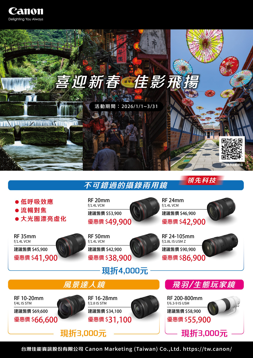 Canon 喜迎新春 佳影飛揚:《鏡頭篇》 活動時間:2026/1/1-3/31。