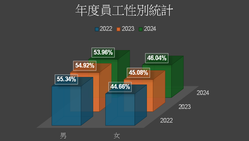 建達國際全體員工皆屬於永久聘雇員工類型,並提供部分工作機會給有兼職需求的人員,目前並無非員工工作者。公司提供長遠且安穩的工作型態,讓員工能夠全心投入工作而無後顧之憂,有助於保障員工的經濟生活。其次,女性員工與男性員工人數趨於對等。至於年齡分布而言,建達國際現階段以中壯年員工為主幹,由資深具有實務經驗的主管帶領年輕團隊衝刺,人力結構穩定,無發生人力缺口之虞。