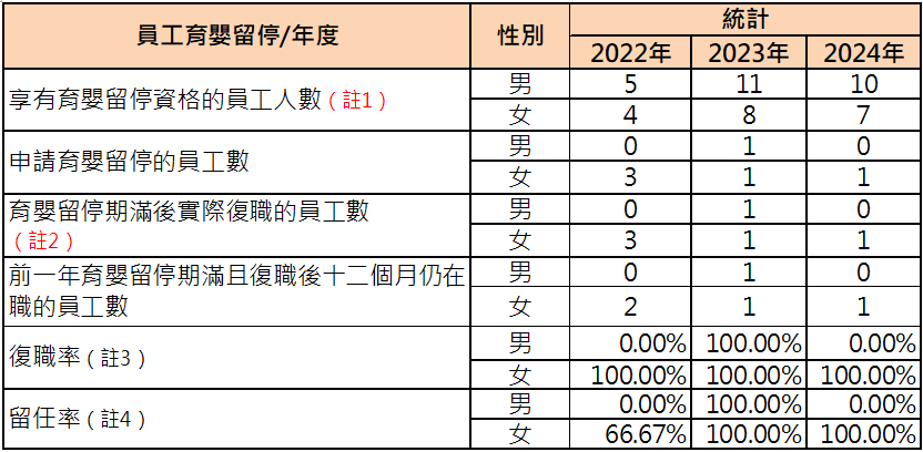 ※註4:留任率=(復職後十二個月仍在職員工總數 / 前一年度實際復職人數)*100%。