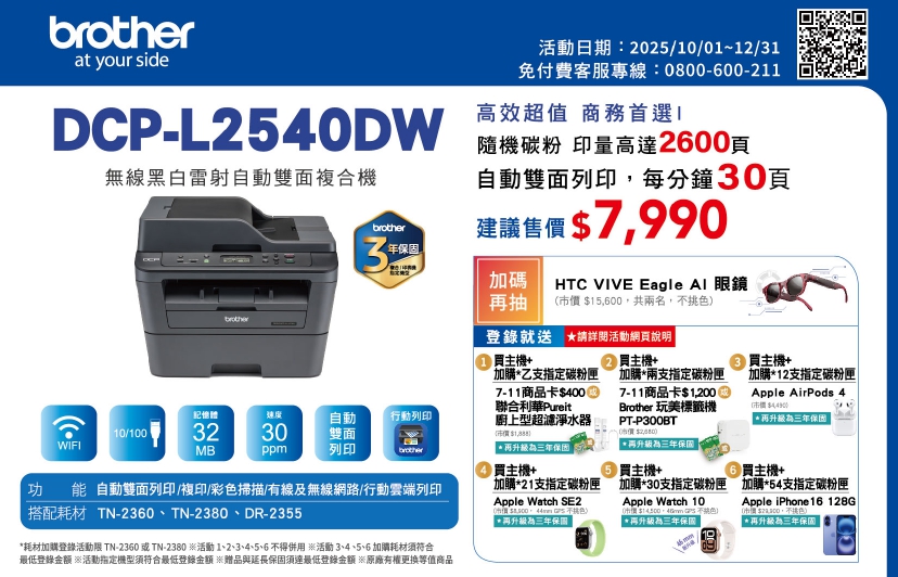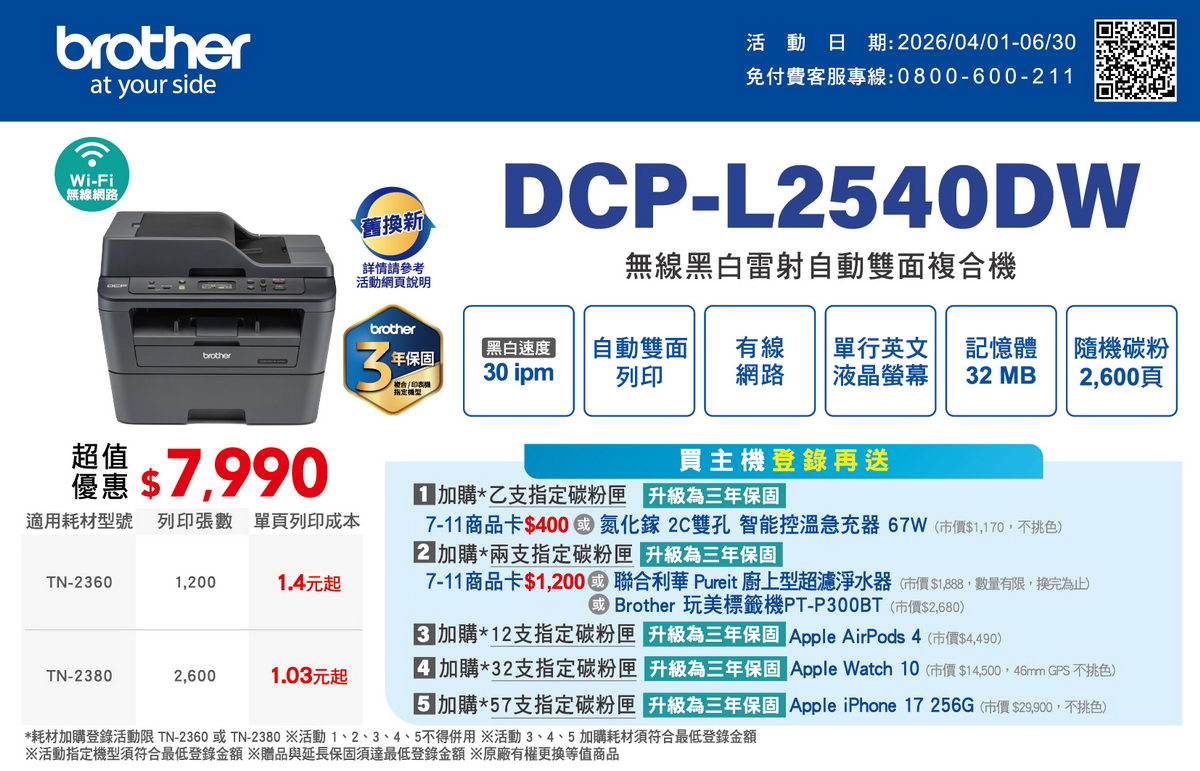 | 保固期 | 自購買日起12個月(提供有效憑證:發票,出貨單,3C連鎖店消費證明)。 相關資訊請參考原廠服務資訊網頁http://www.brother.tw/Service/HowToRepair.aspx |