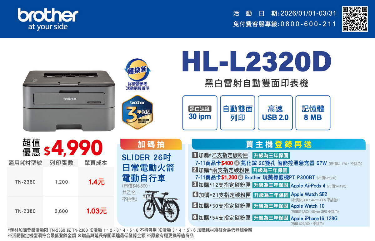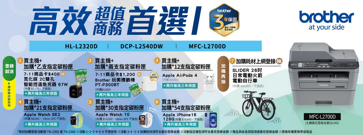 | 保固期 | 自購買日起12個月(提供有效憑證:發票,出貨單,3C連鎖店消費證明)。 相關資訊請參考原廠服務資訊網頁http://www.brother.tw/Service/HowToRepair.aspx |
