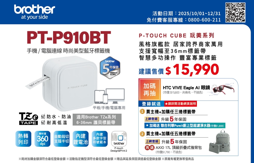 BROTHER PT-P910BT Brother手機電腦藍芽PT-P910BT手機/電腦連線 兩用內附鋰電池,自動裁刀TZe護貝標籤帶(3.5~36mm) 建達料號:OPBRPT-P910BT 原廠型號:PT-P910BT 建議售價:$ 15,990 (含稅) 我要購買 商品介紹