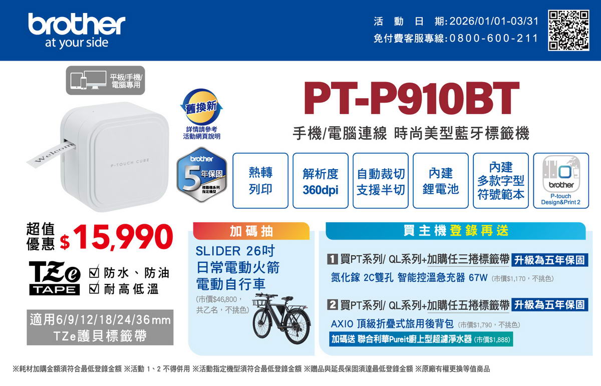 BROTHER PT-P910BT Brother手機電腦藍芽PT-P910BT手機/電腦連線 兩用內附鋰電池,自動裁刀標籤帶類型: TZE 護貝標籤帶 6.9.12.18.24.36mm 建達料號:OPBRPT-P910BT 原廠型號:PT-P910BT 建議售價:$ 15,990 (含稅) 我要購買 商品介紹