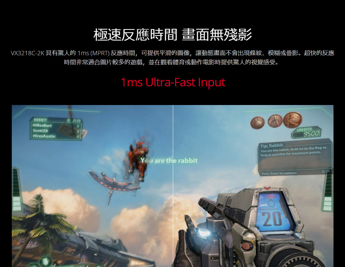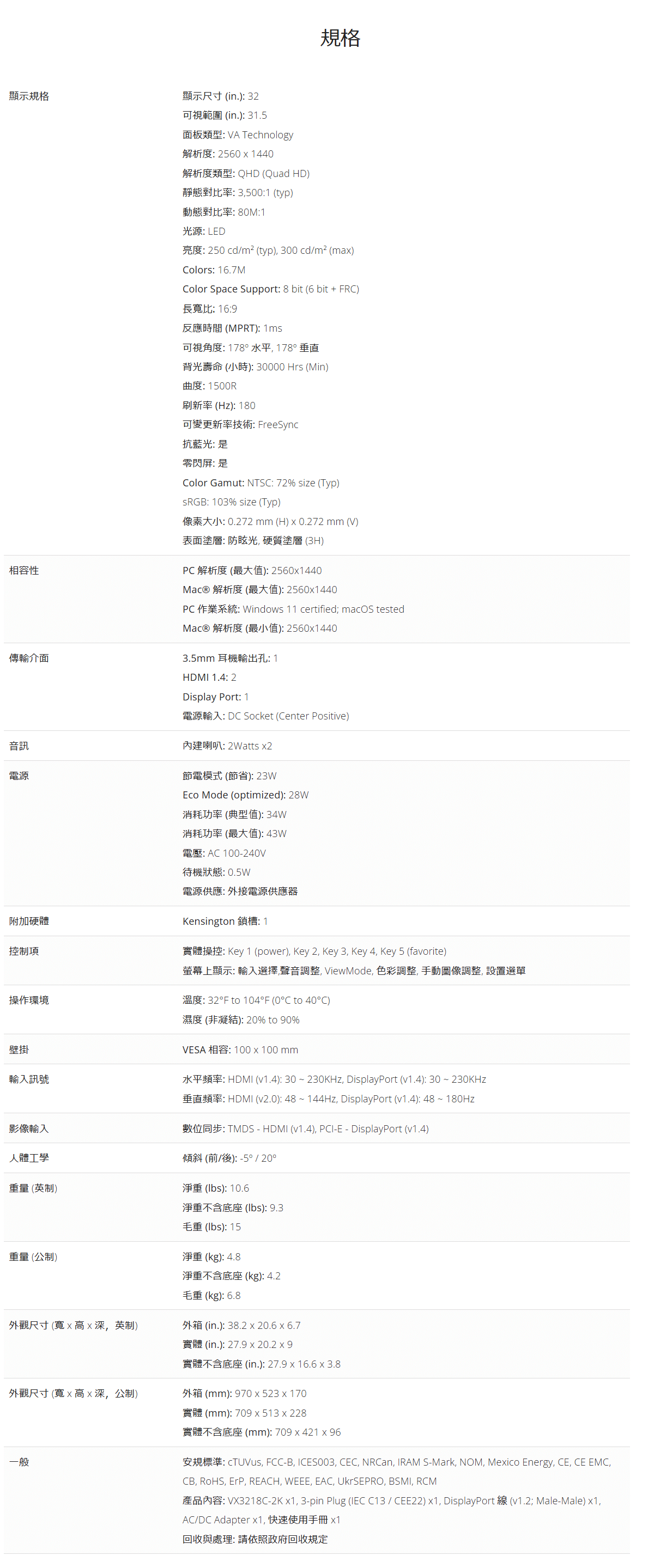 - 32" 180Hz曲面QHD/面板-VA/2560x1440/LED光