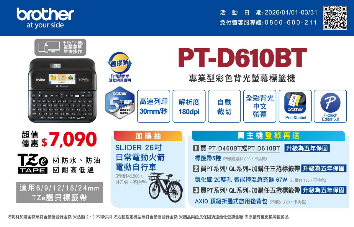 Brother P-Touch PT- D610BT 商務專業連接標籤機/藍芽/最大列印高度::18mm/速度:30mm/s標籤帶寬度(3.5,6,9,12,18,24 mm)/可儲存99個檔案 建達料號:OPBRPT-D610BT 原廠型號:PT-D610BT 建議售價:$ 7,090 (含稅) 我要購買 商品介紹