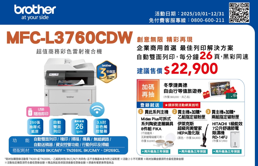 BROTHER MFC-L3760CDW多功能彩色雷射印表機