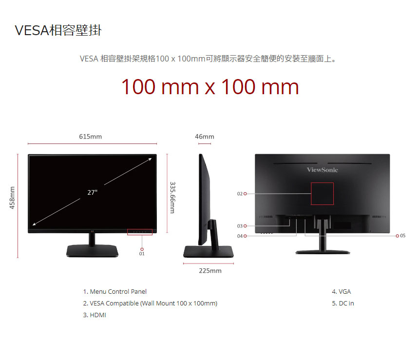 - 更新率100Hz/VGA+HDMI/壁掛尺寸:100x100mm