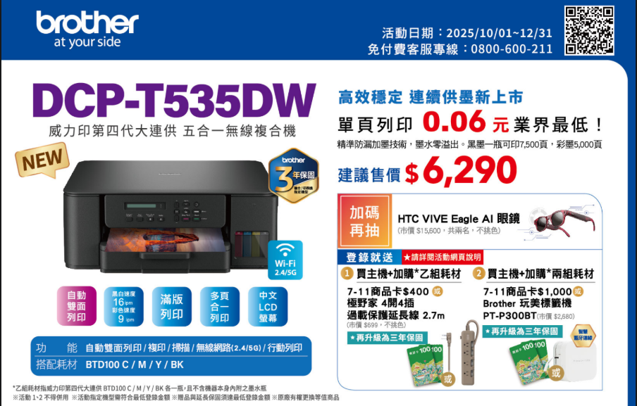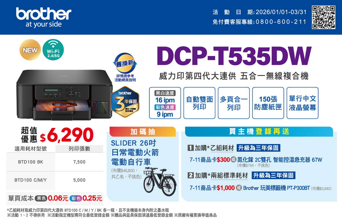 BROTHER 第四代威力印DCP-T535DW 威力印大連供雙面無線五合一複合機列印│雙面│複印│掃描│WIFI列印速度:16 / 9 ipm適用墨水:BTD100 BK/C/M/Y 建達料號:INBRDCP-T535DW 原廠型號:DCP-T535DW 建議售價:$ 6,290 (含稅) 我要購買 商品介紹 商品規格