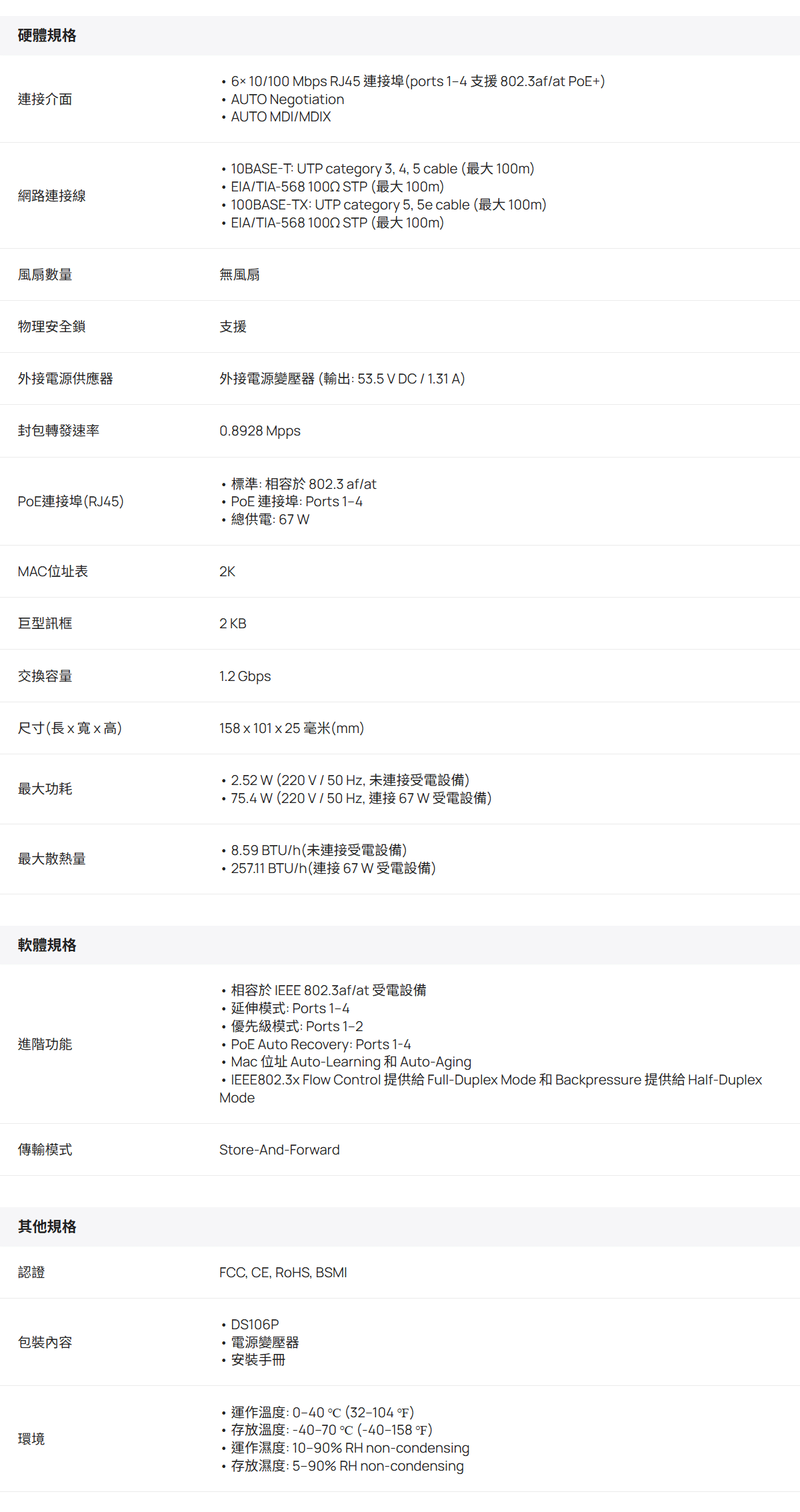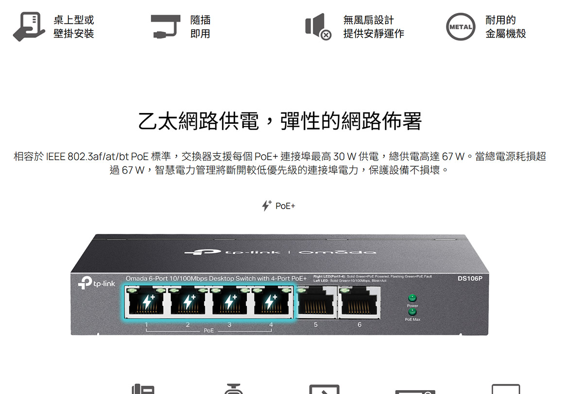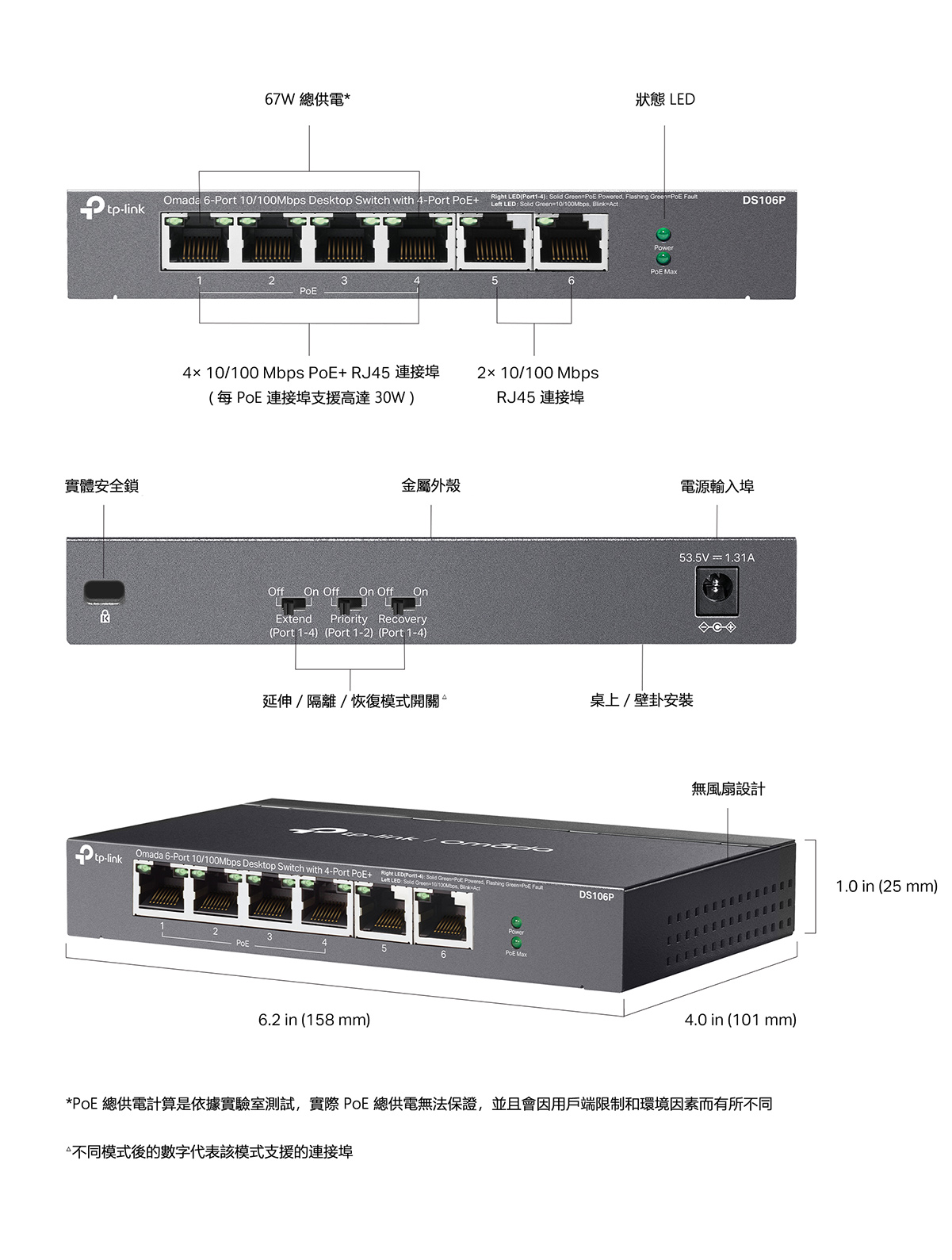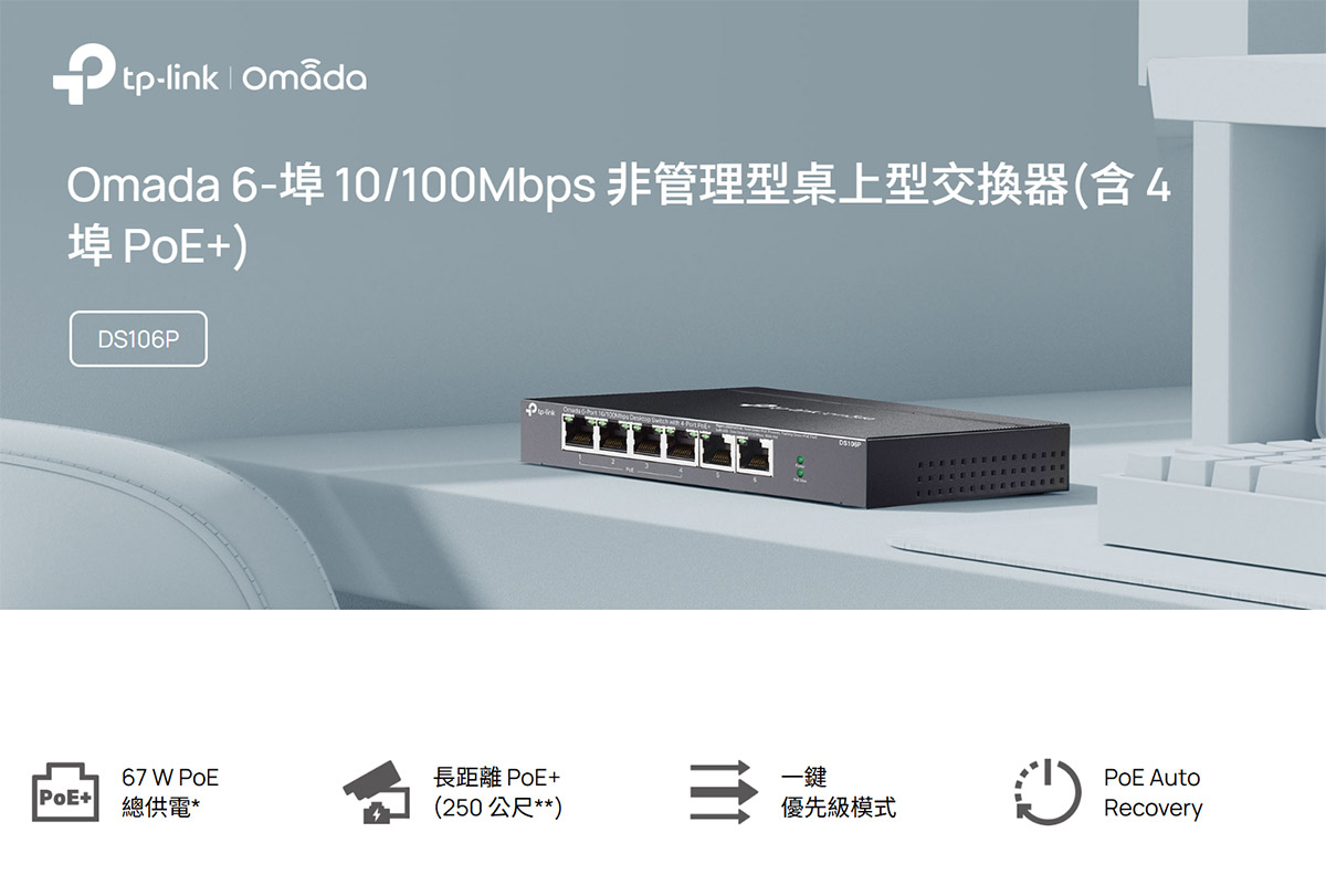 TP-LINK Omada 6-埠10/100Mbps 非管理型桌上型交換器(含 4 埠 PoE+) ( DS106P(UN) Ver:1.0 )