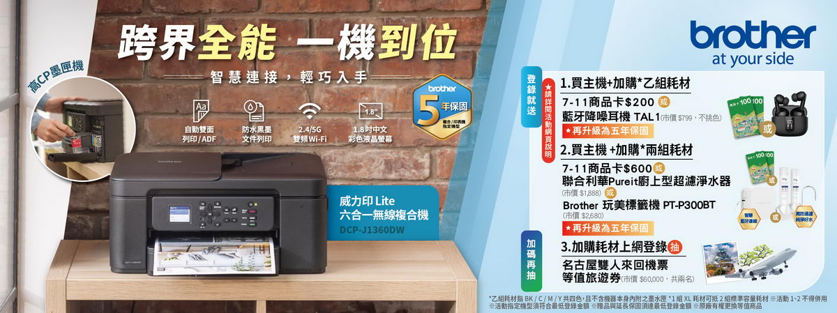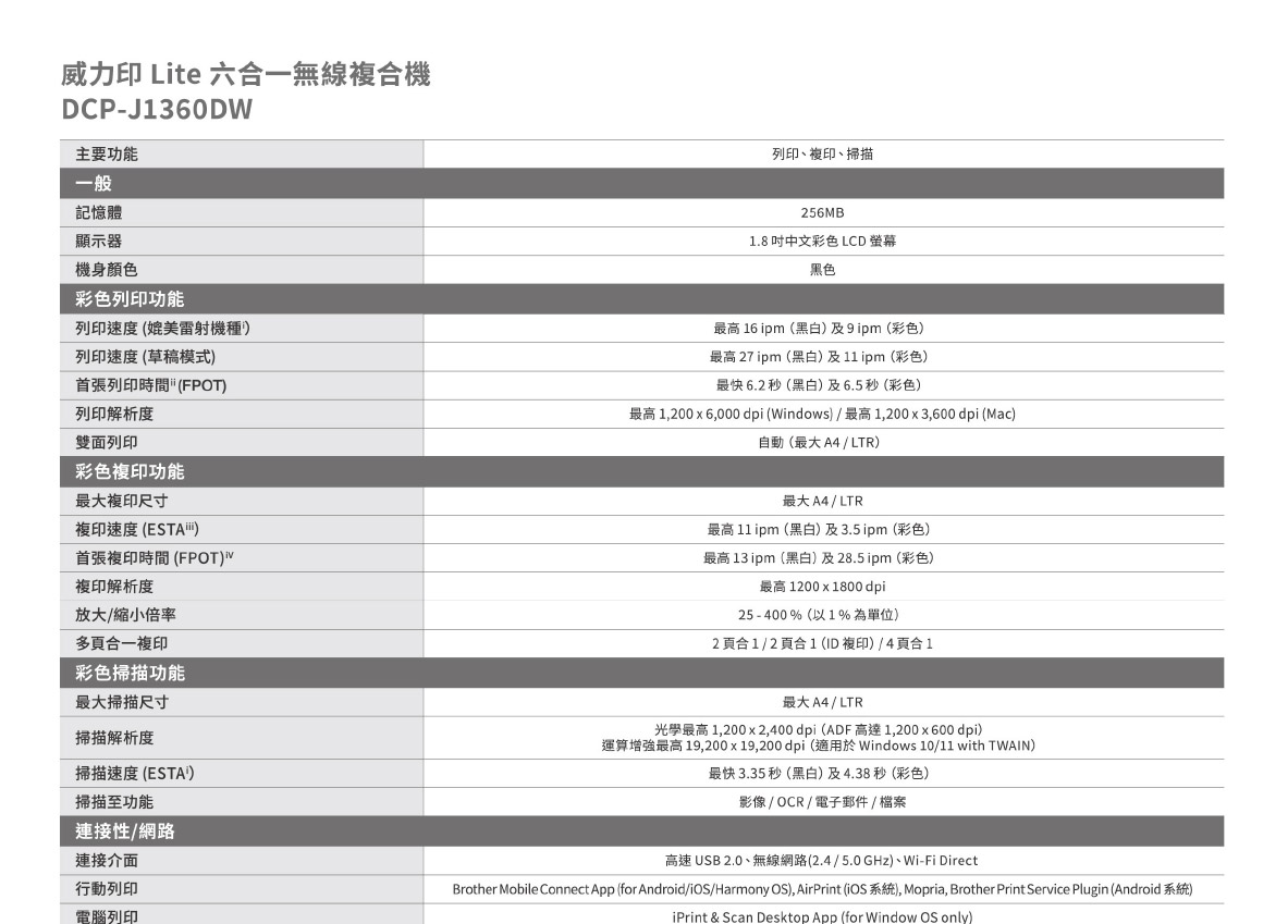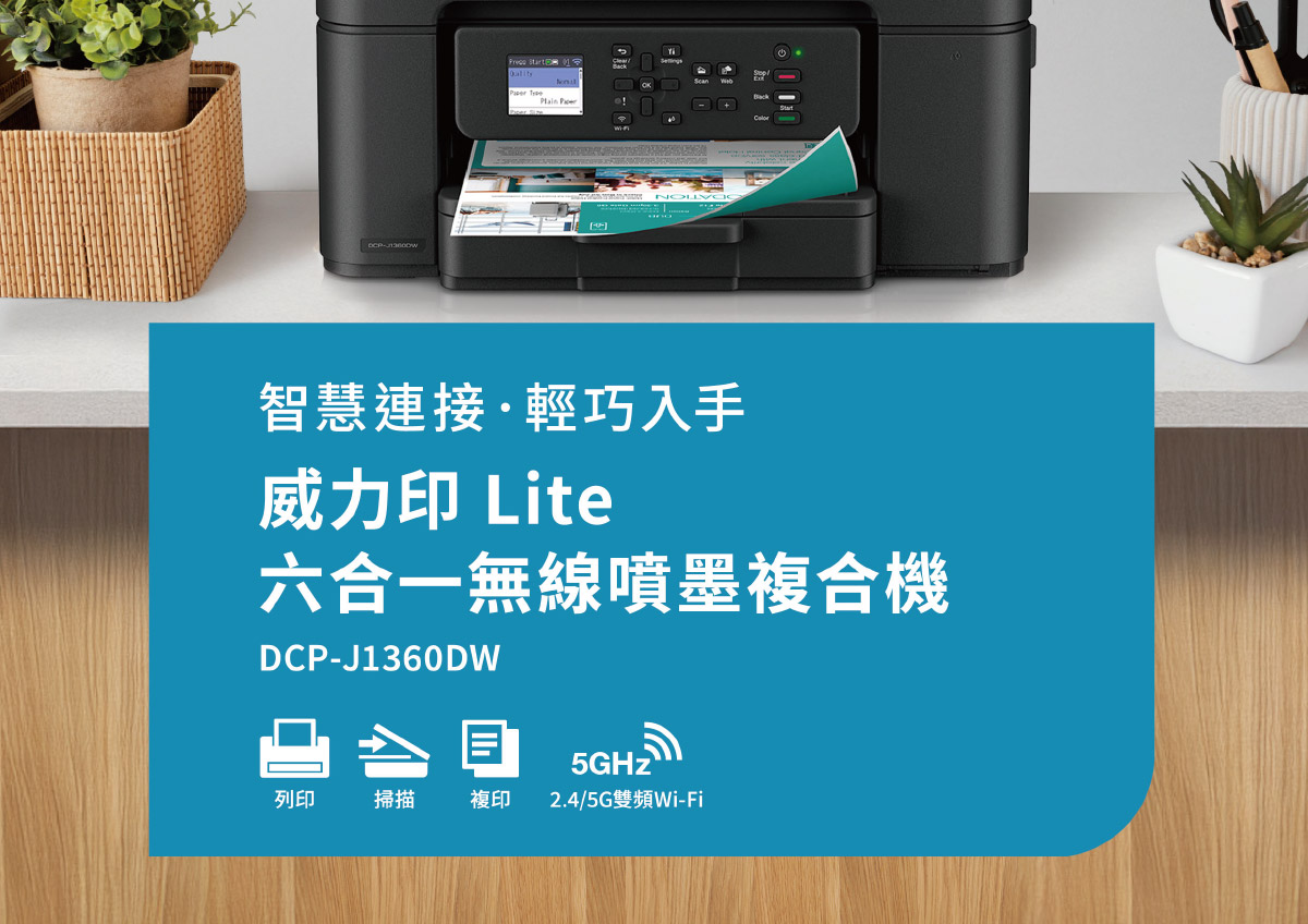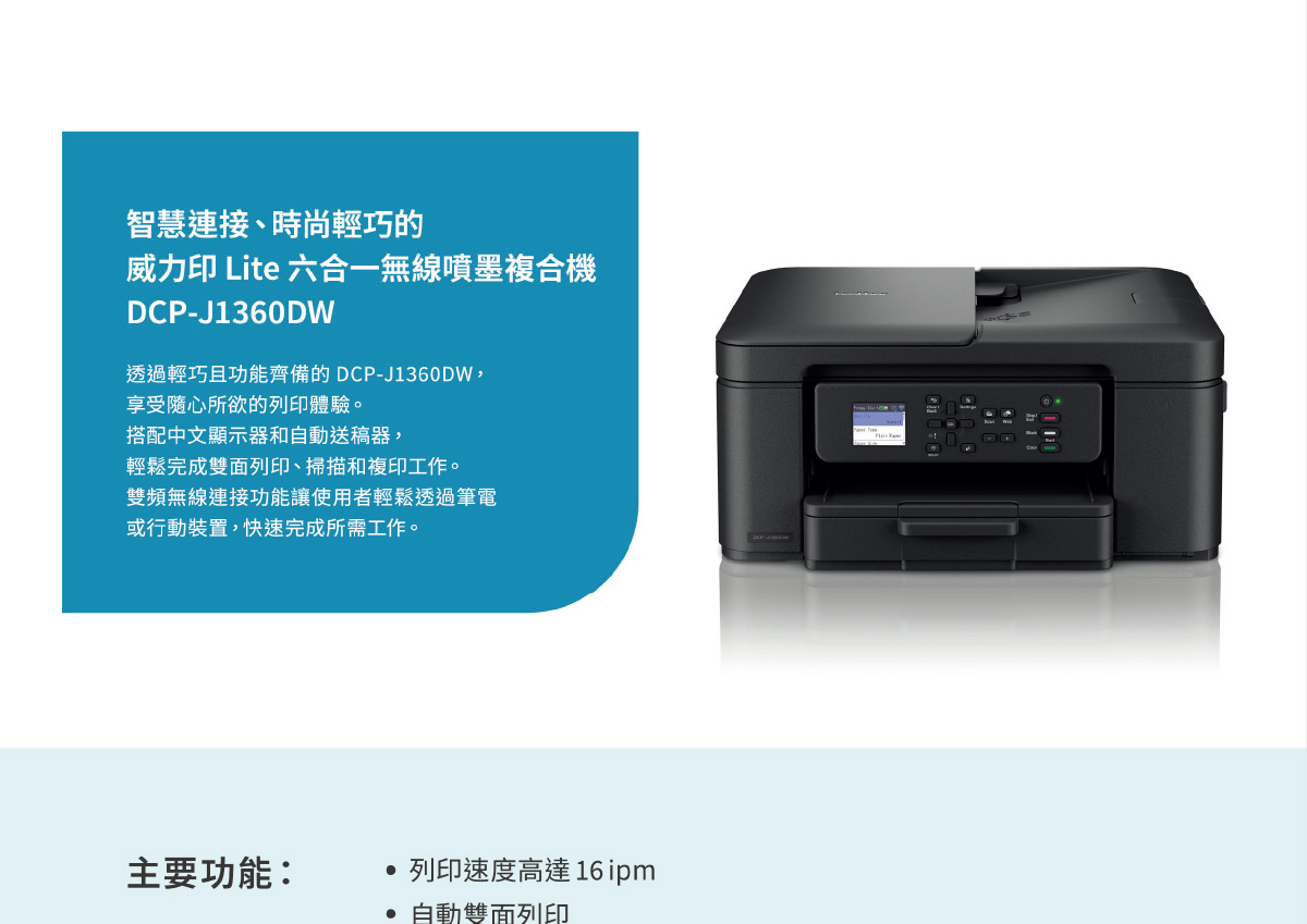 BROTHER Mini21SL DCPJ1360DW 繁體中文顯示,雙頻無線網路抽屜式紙匣(體積輕巧)加購耗材5年保固 >> 業界最久 建達料號:INBRDCPJ1360DW 原廠型號:DCPJ1360DW 建議售價:$ 2,990 (含稅) 我要購買 商品介紹