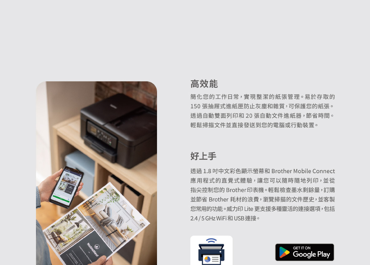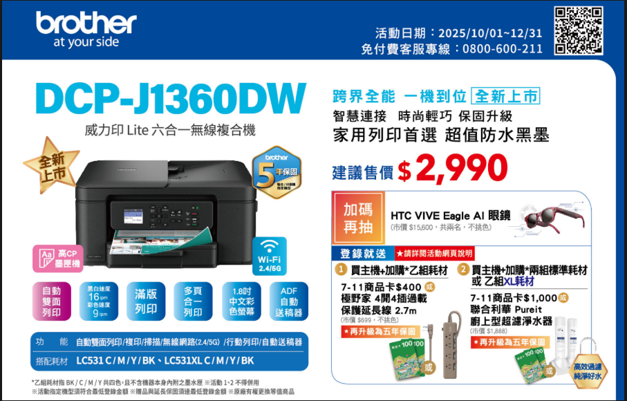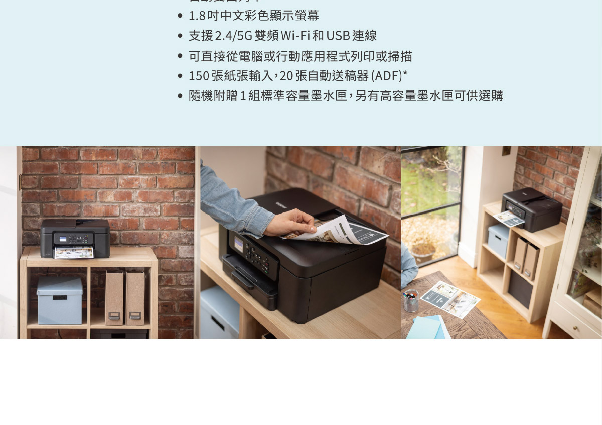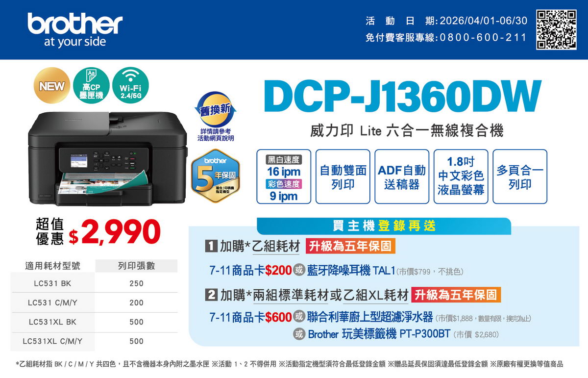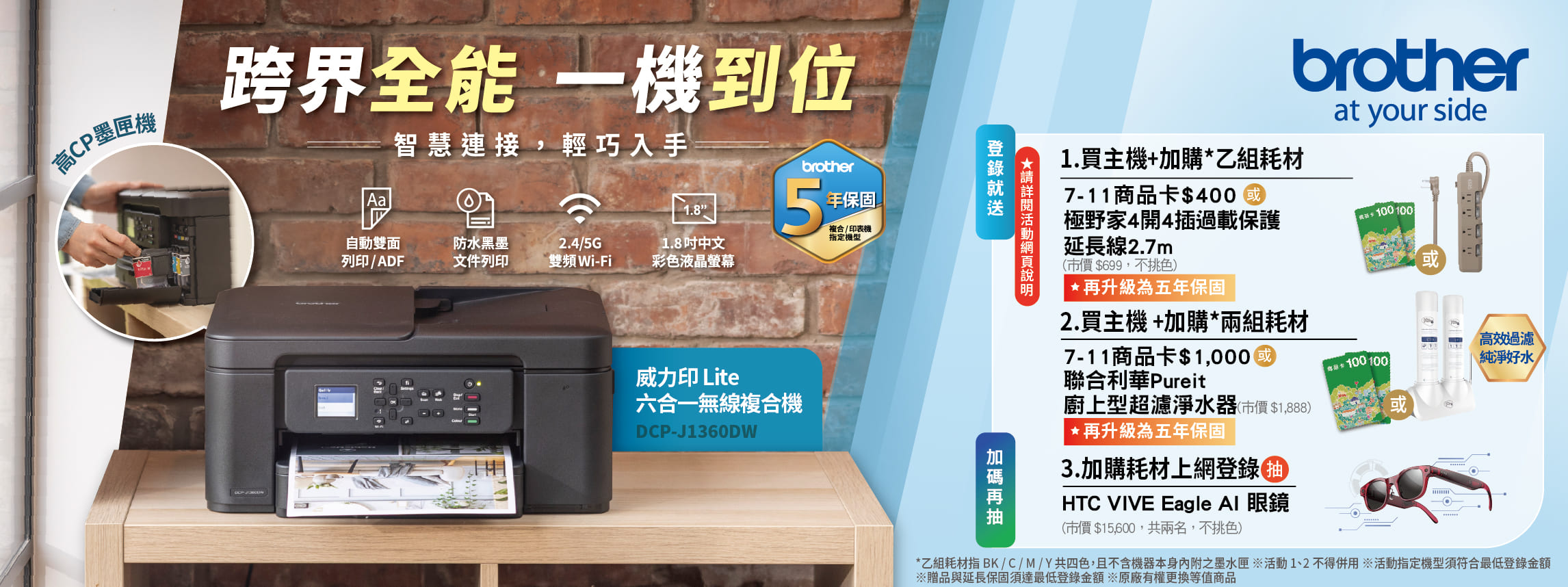 BROTHER Mini21SL DCPJ1360DW 繁體中文顯示,雙頻無線網路抽屜式紙匣(體積輕巧)加購耗材5年保固 >> 業界最久 建達料號:INBRDCPJ1360DW 原廠型號:DCPJ1360DW 建議售價:$ 2,990 (含稅) 我要購買 商品介紹