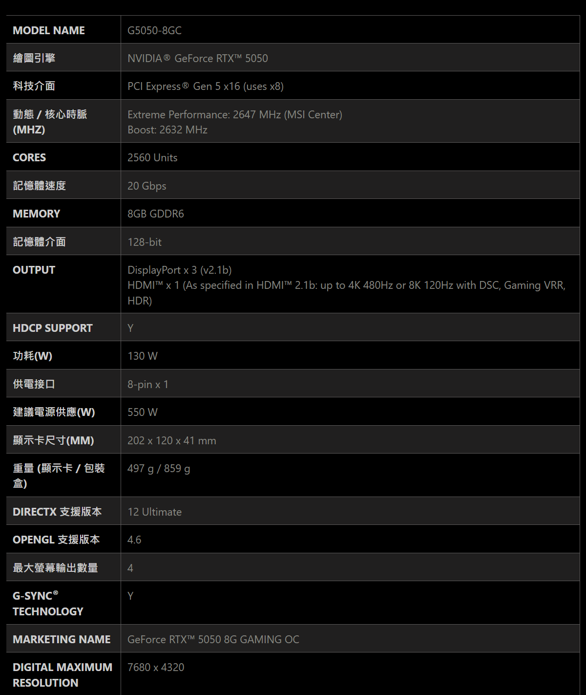 GeForce RTX 5050 8G GAMING OC 4711377379946