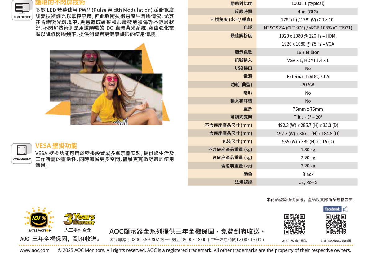 | 保固期 | 自購買日起3年,建議請購買者至AOC網站http://www.aocmonitorap.com/taiwan_bchinese/warranty.php 上註冊,作為後續保固服務依據。 |