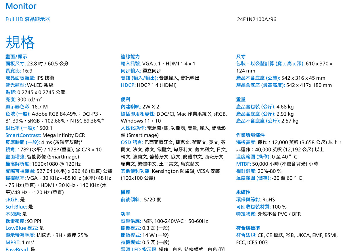PHILIPS 24E1N2100A 24" 液晶顯示器