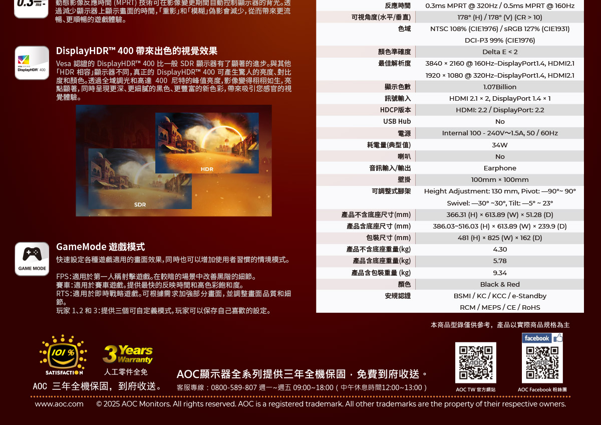 | 保固期 | 自購買日起3年,建議請購買者至AOC網站http://www.aocmonitorap.com/taiwan_bchinese/warranty.php 上註冊,作為後續保固服務依據。 |