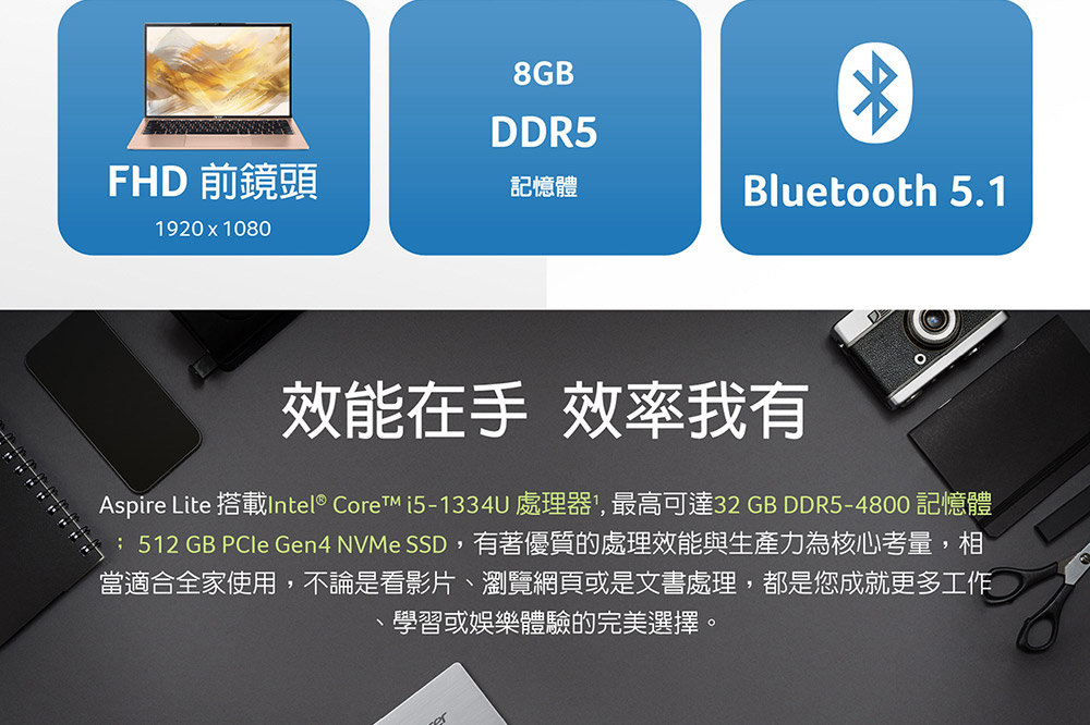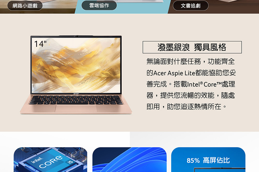 ACER Aspire Lite系列:AL14-52M-5461(金) ( NX.DDNTA.001 ) 14" IPS/16:10/霧面/LED背光Intel® Core™ 5 processor 120U8GB DDR5/512GB PCIe Gen4 SSDWin11 Home/A/D蓋金屬/不附鼠包 建達料號:NBACNXDDNTA001 原廠型號:NX.DDNTA.001 建議售價:$ 20,900 (含稅) 我要購買 商品介紹