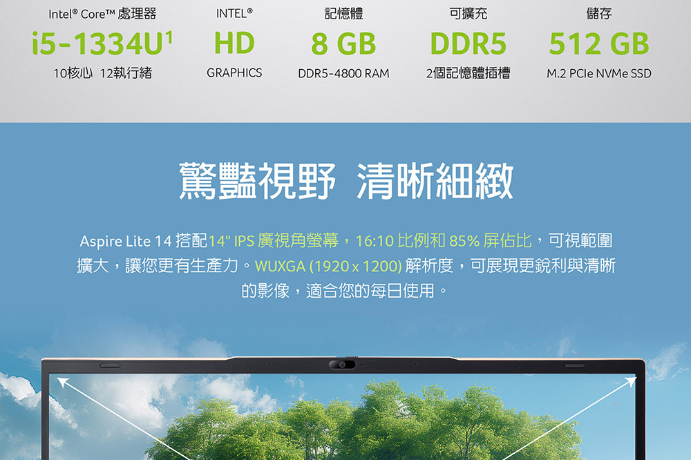 ACER Aspire Lite系列:AL14-52M-55K2(銀) ( NX.DDYTA.001 ) 14" IPS/16:10/霧面/LED背光Intel® Core™ 5 processor 120U8GB DDR5/512GB PCIe Gen4 SSDWin11 Home/A/D蓋金屬/不附鼠包 建達料號:NBACNXDDYTA001 原廠型號:NX.DDYTA.001 建議售價:$ 20,900 (含稅) 我要購買 商品介紹