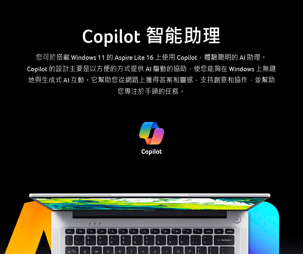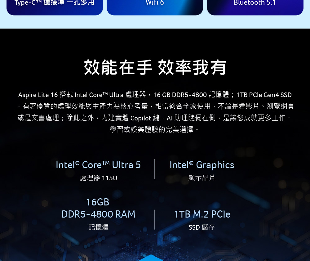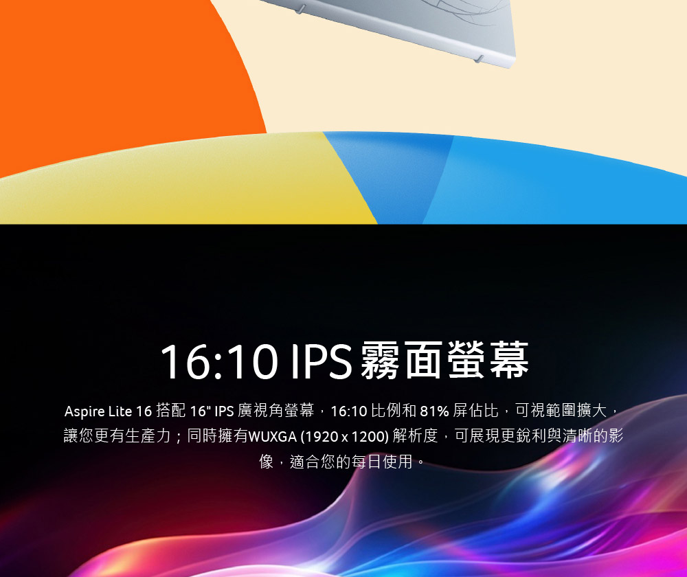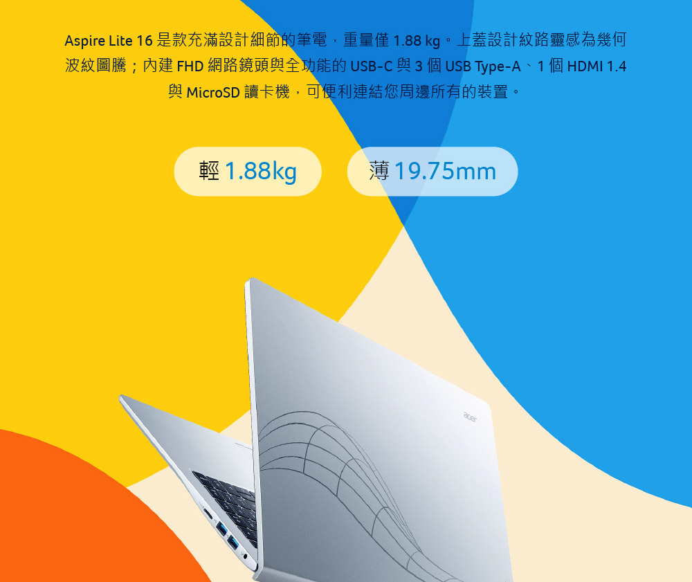 ACER Aspire Lite系列:AL16-53P-51Y1(銀) ( NX.J8CTA.001 ) 16" IPS/16:10/霧面/LED背光Intel Core Ultra 5 processor 115U/I16GB DDR5/1TB PCIe Gen4 SSDWin11 Home/不附鼠包 建達料號:NBACNXJ8CTA001 原廠型號:NX.J8CTA.001 建議售價:$ 25,900 (含稅) 我要購買 商品介紹