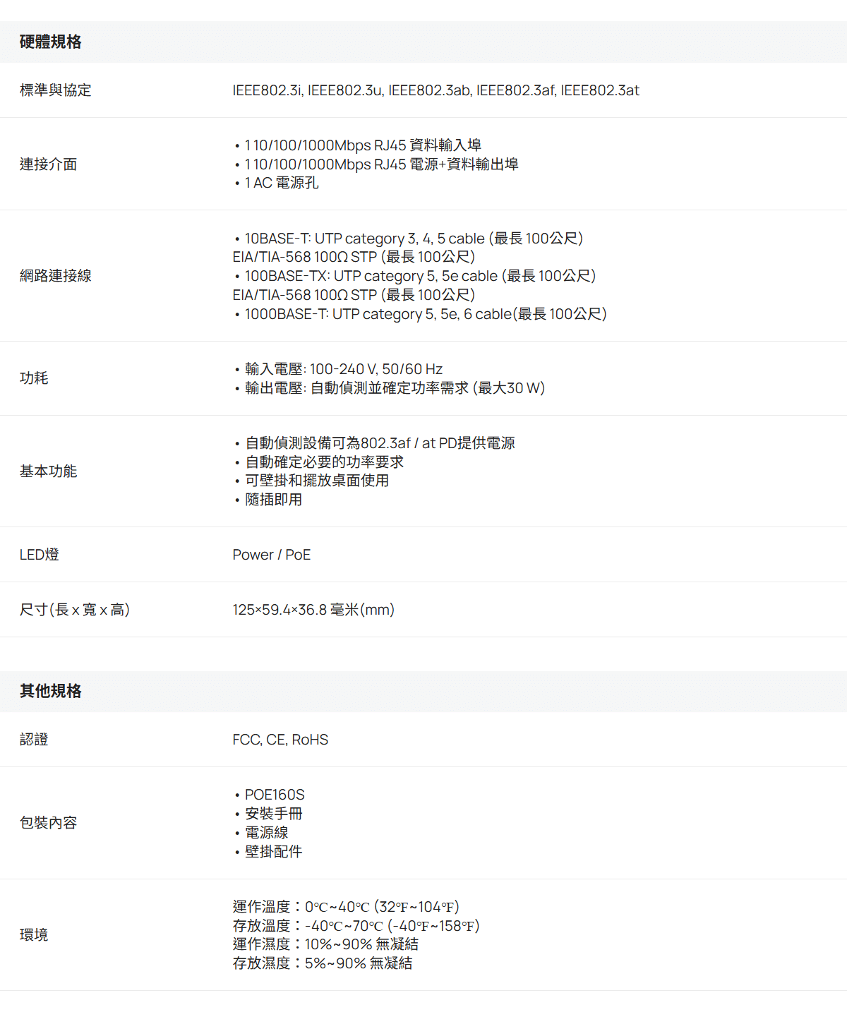 TP-LINK PoE+ 電源供應器/注入器 ( POE160S(UN) Ver:4.0 )