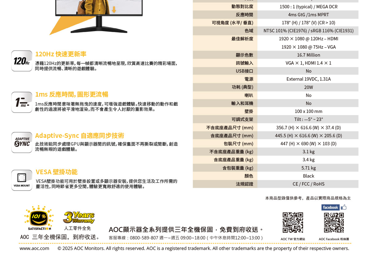 | 保固期 | 自購買日起3年,建議請購買者至AOC網站http://www.aocmonitorap.com/taiwan_bchinese/warranty.php 上註冊,作為後續保固服務依據。 |