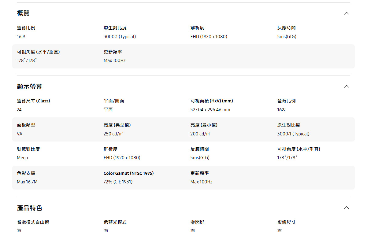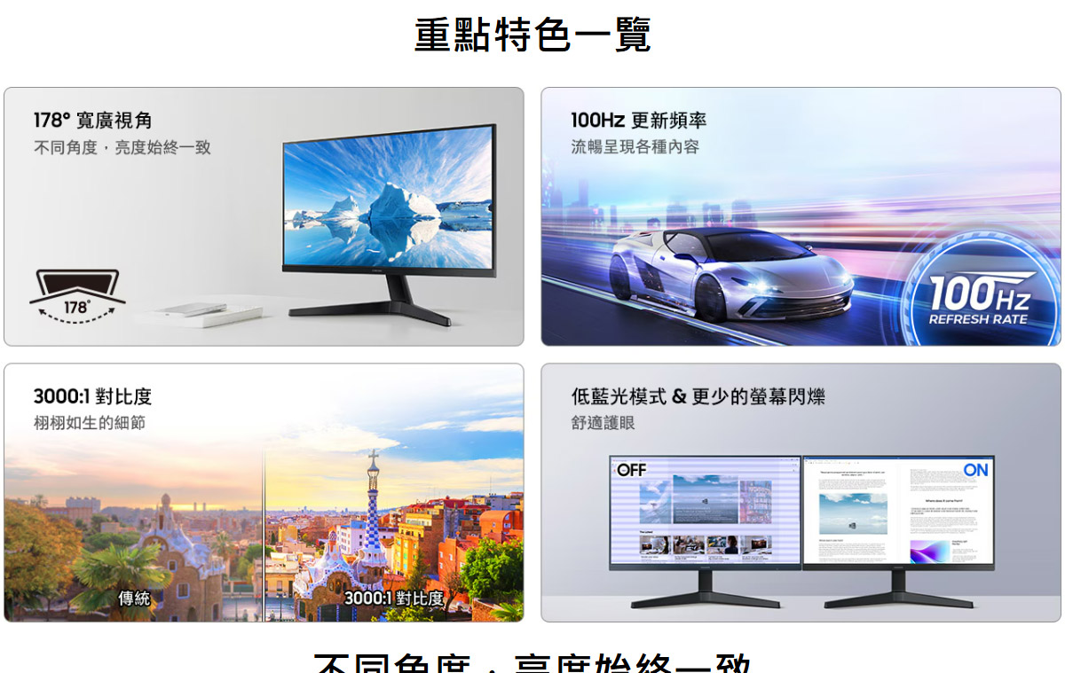 Samsung 24吋 S3 平面顯示器 F332 ( LS24F332EACXZW ) VA/FHD(1920*1080)/250cd/㎡/16:9 /反應時間5ms(MPRT) /刷新率100Hz /可視角178/178 /HDMI1.4*1,D-Sub*1、低藍光零閃屏 建達料號:LCSAS24F332EAC 原廠型號:LS24F332EACXZW 建議售價:$ 2,390 (含稅) 我要購買 商品介紹