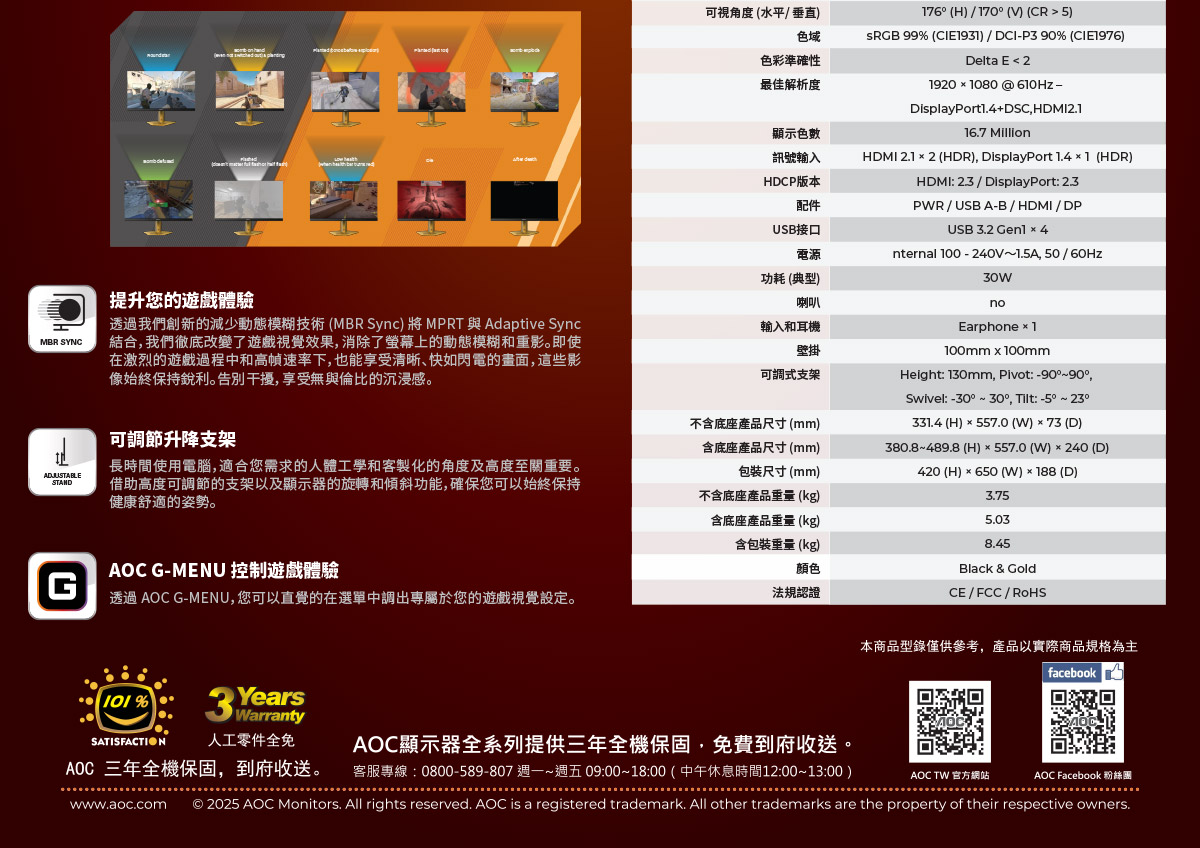 | 保固期 | 自購買日起3年,建議請購買者至AOC網站http://www.aocmonitorap.com/taiwan_bchinese/warranty.php 上註冊,作為後續保固服務依據。 |