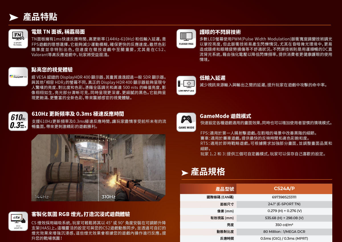 - 反應時間0.5ms (GtG) / 0.3ms (MPRT)
