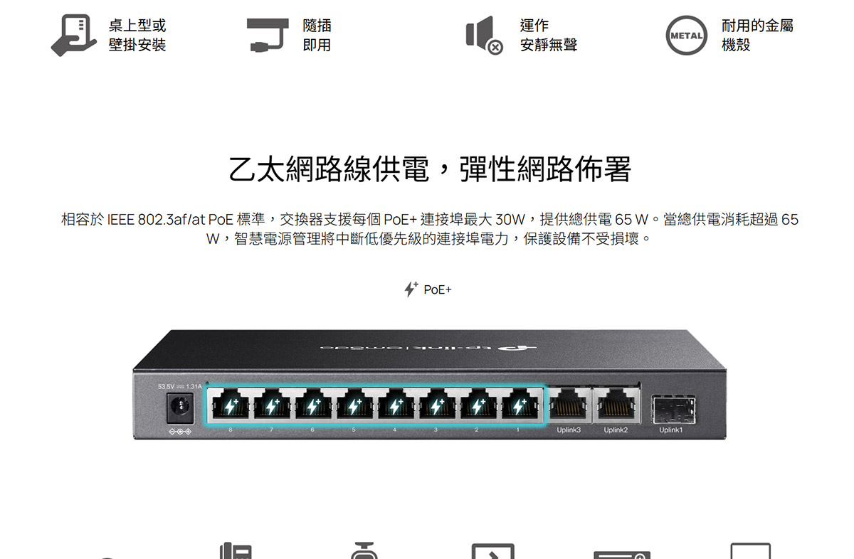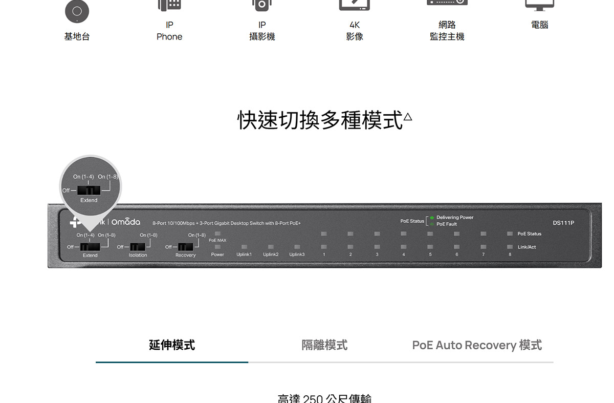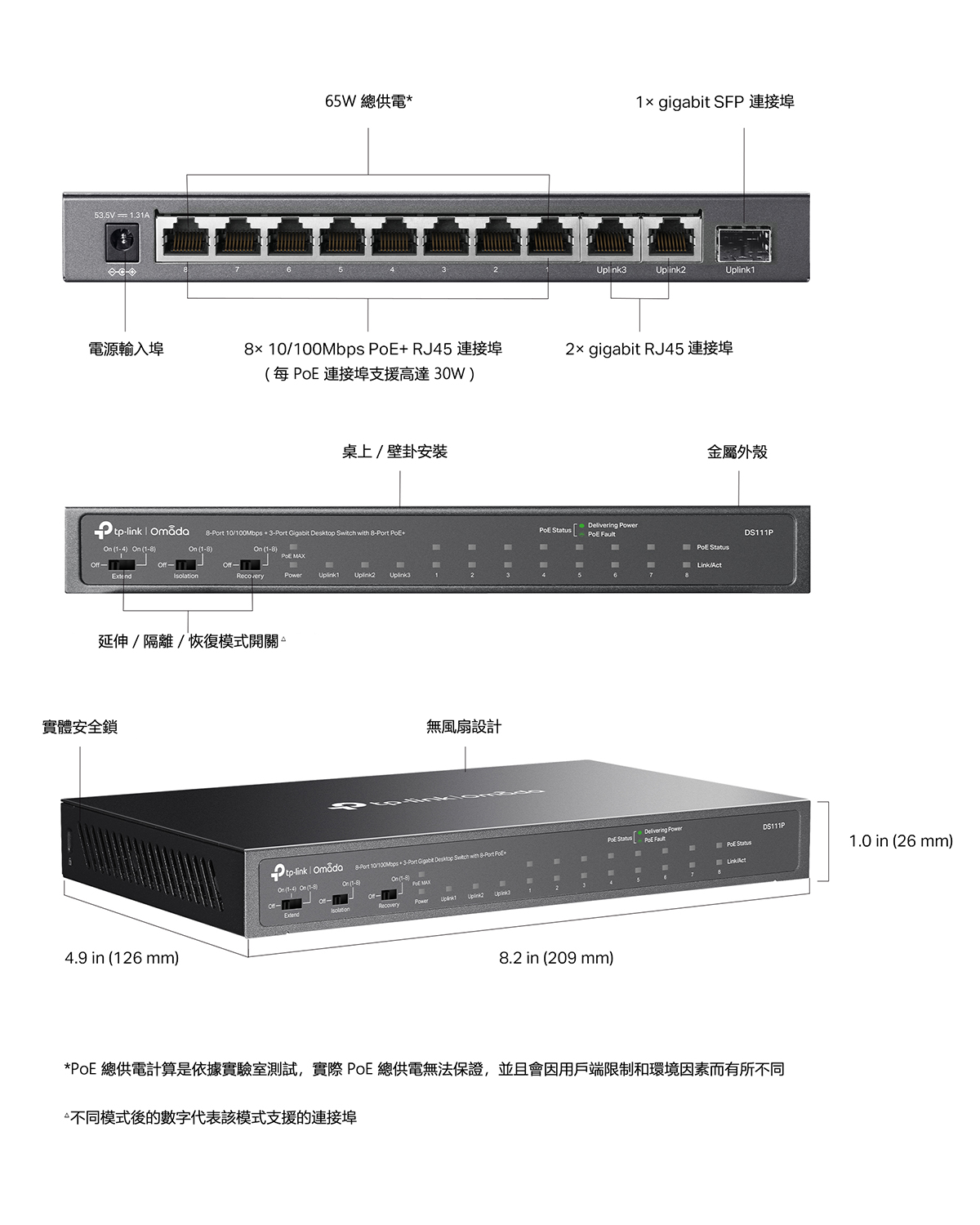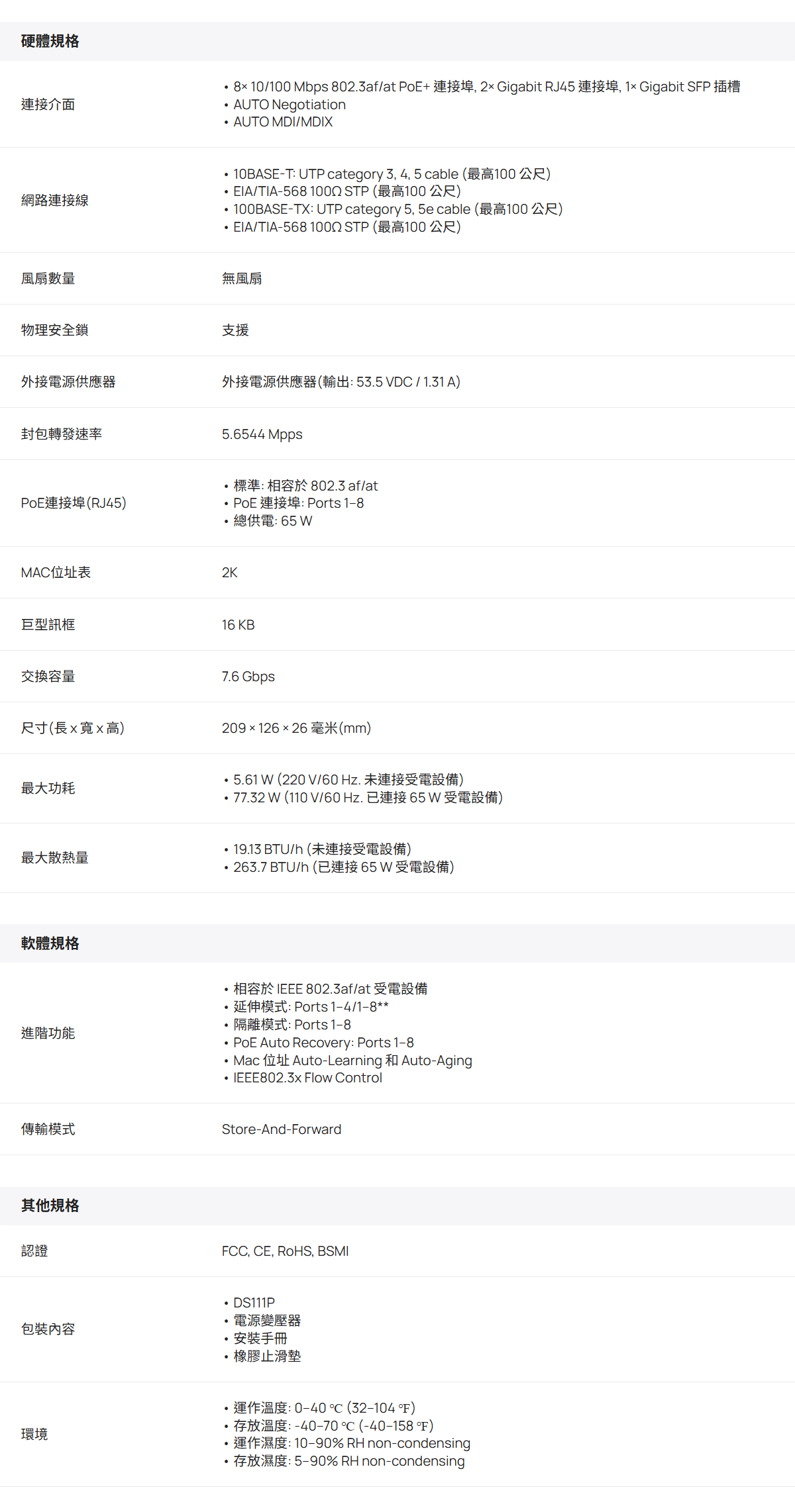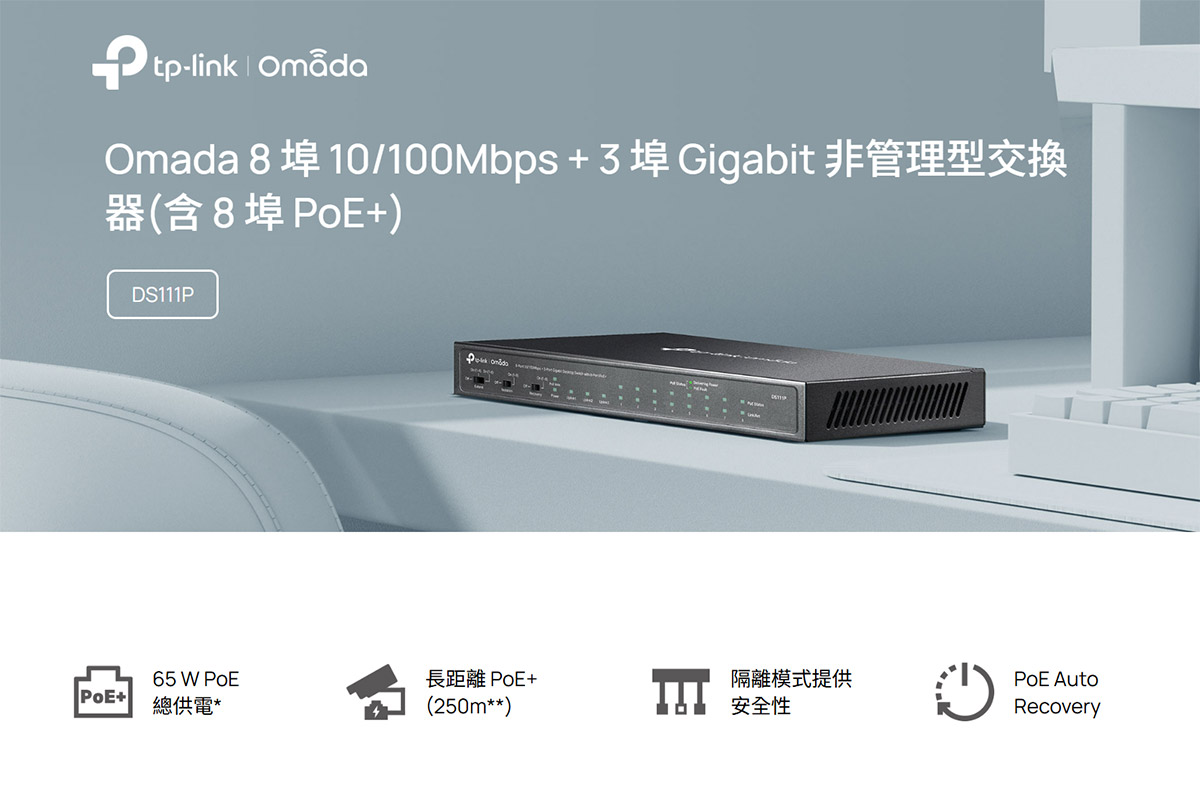 TP-LINK Omada 8 埠10/100Mbps + 3 埠 Gigabit 非管理型桌上型交換器(含 8 埠 PoE+) ( DS111P(UN) Ver:1.0 )