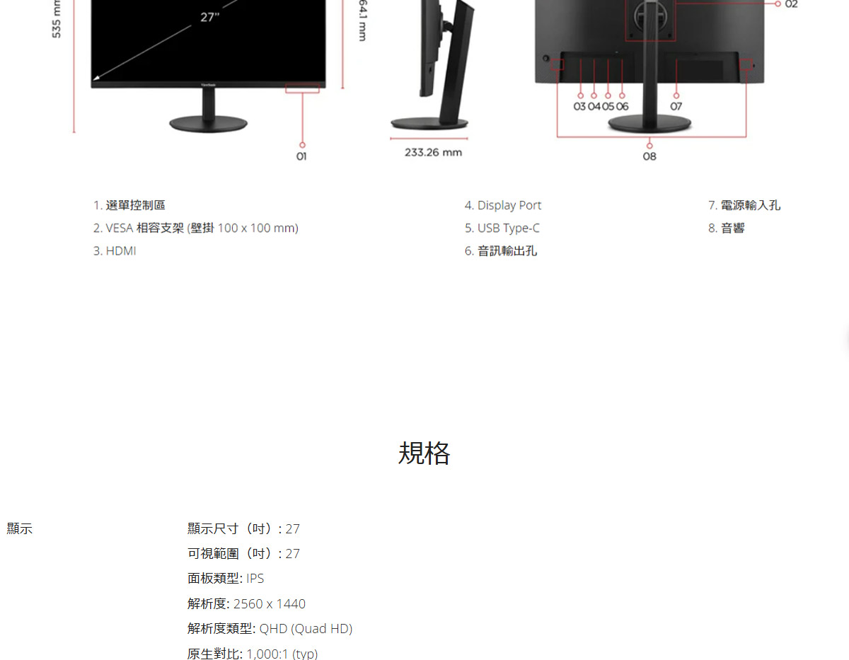 ViewSonic 優派VG2708U-2K 27"顯示器