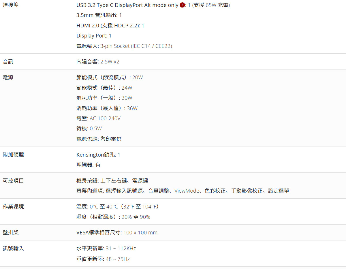 - 刷新率75Hz/USB Type-c,DP*1,ST3.5mm*1,H