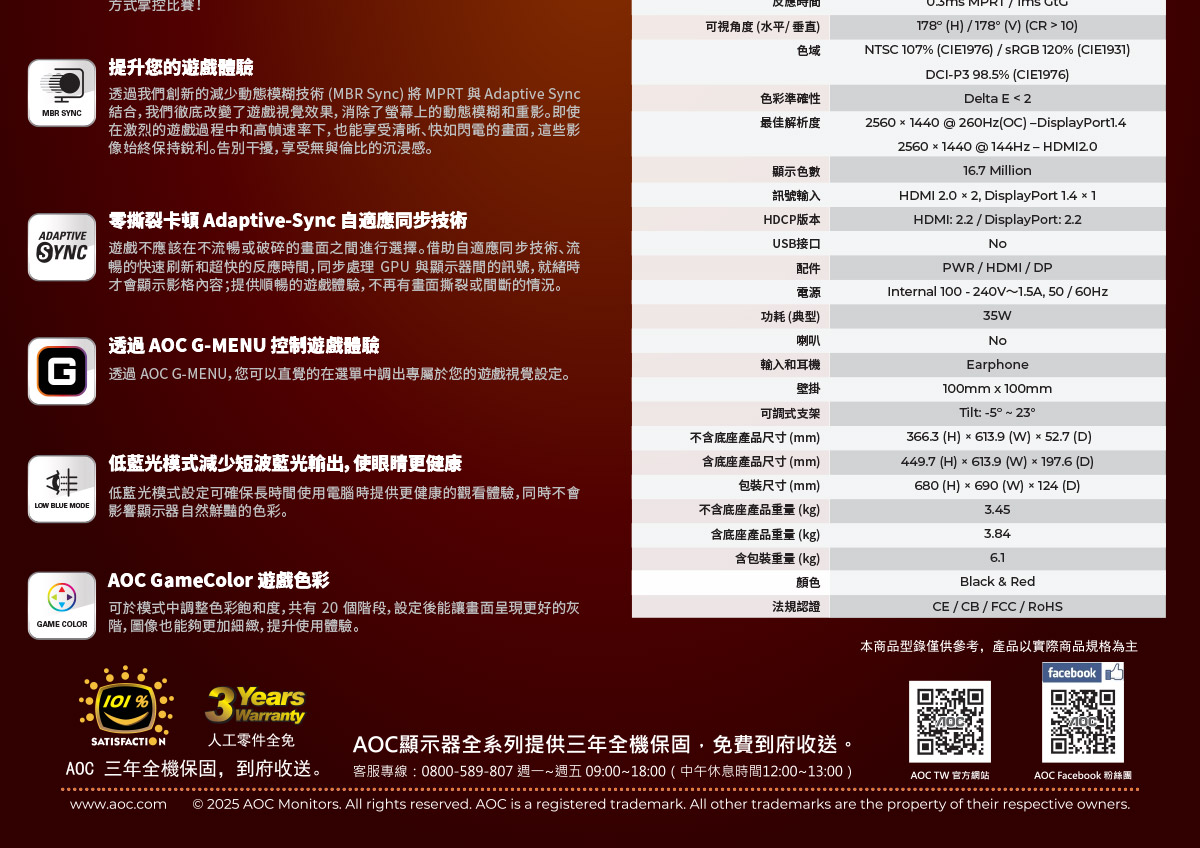 | 保固期 | 自購買日起3年,建議請購買者至AOC網站http://www.aocmonitorap.com/taiwan_bchinese/warranty.php 上註冊,作為後續保固服務依據。 |