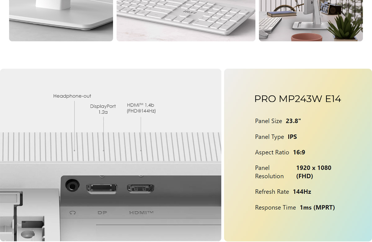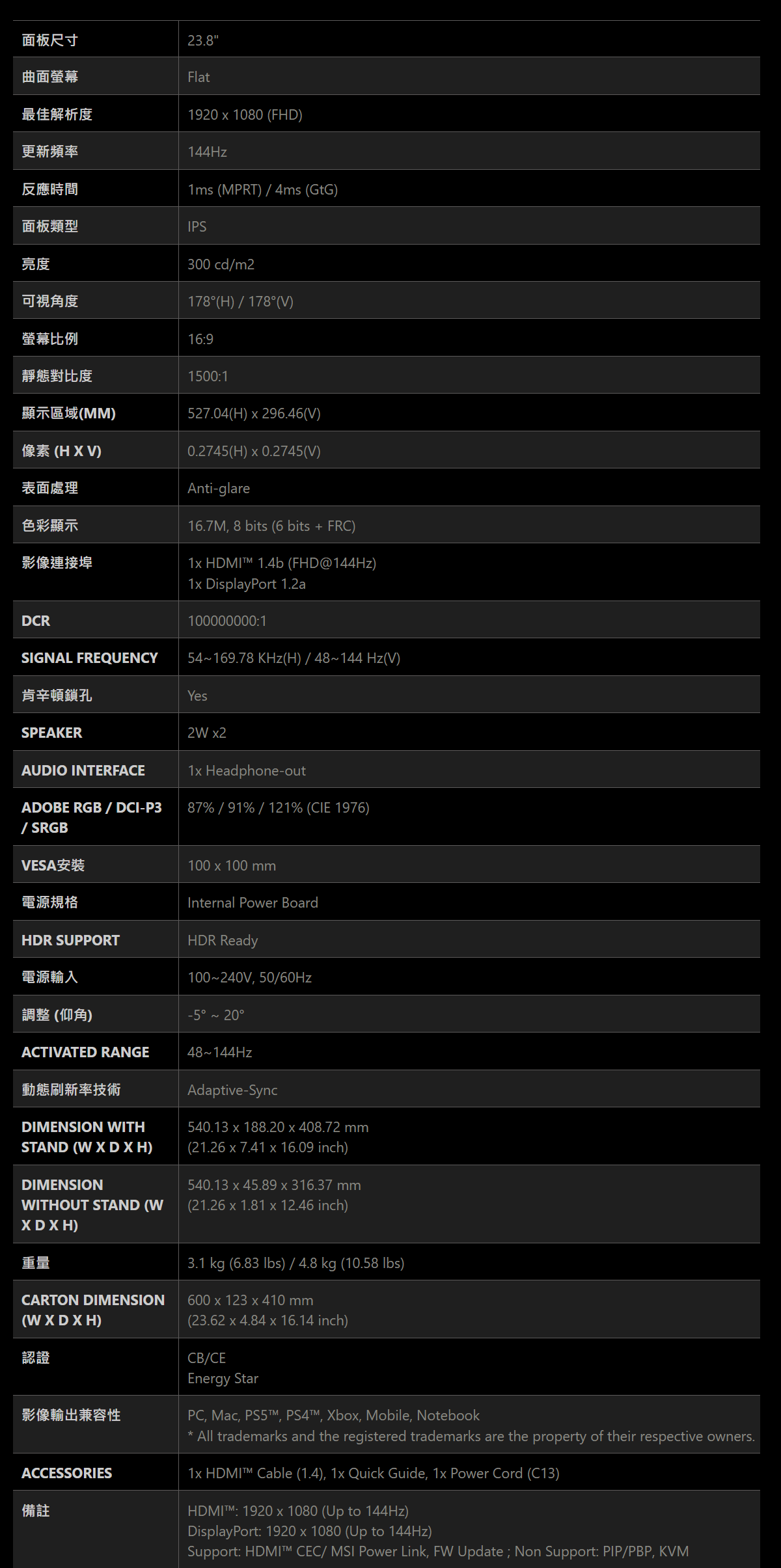 - 23.8"FHD(1920x1080)/144Hz/1ms(MPRT