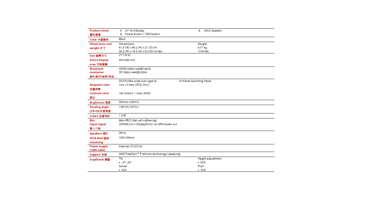 - 可視角(H/V)178/亮度250nits