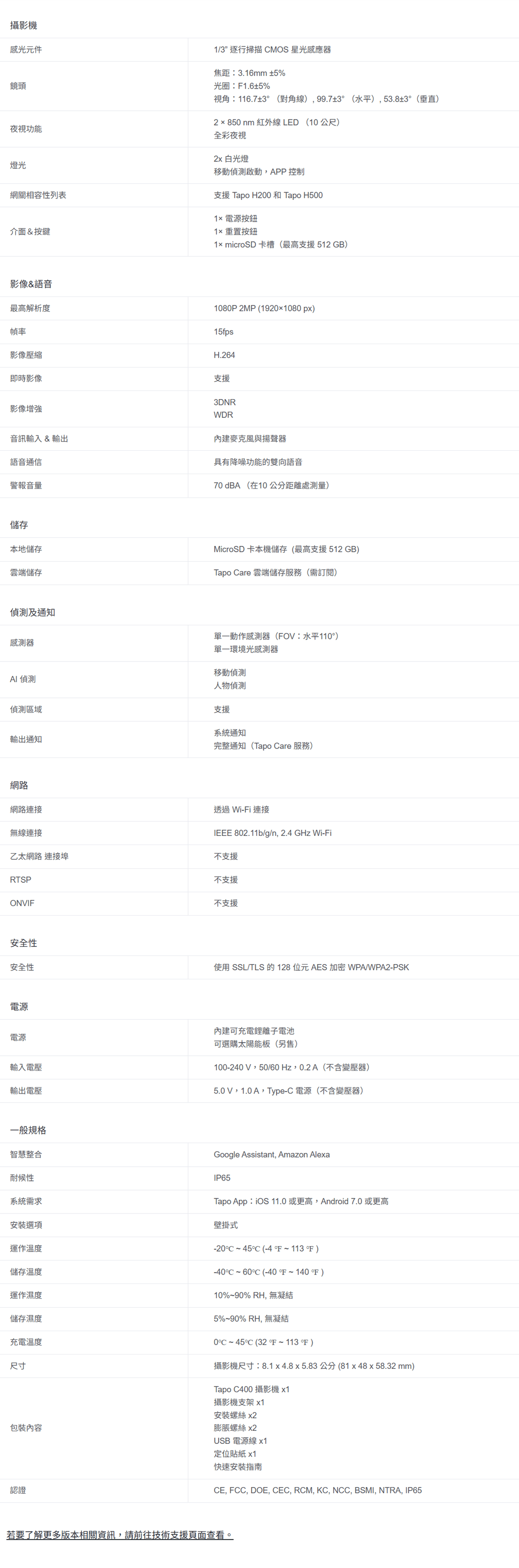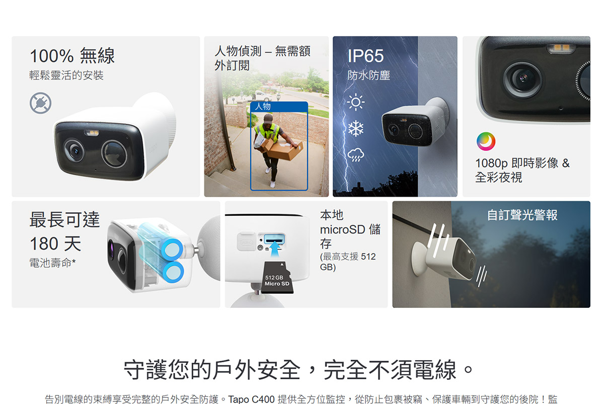 TP-LINK 智慧無線戶外安全攝影機 ( Tapo C400(EU) Ver:2.0 ) 解析度1080P 2MP (1920×1080 px)IP65防水防塵、AI智慧偵測1080p 即時影像 & 全彩夜視內建 5200mAh 電池microSD 卡槽(最高支援 512 GB) 建達料號:NCTPC400EUV2 原廠型號:Tapo C400(EU) Ver:2.0 建議售價:$ 1,299 (含稅) 我要購買 商品介紹
