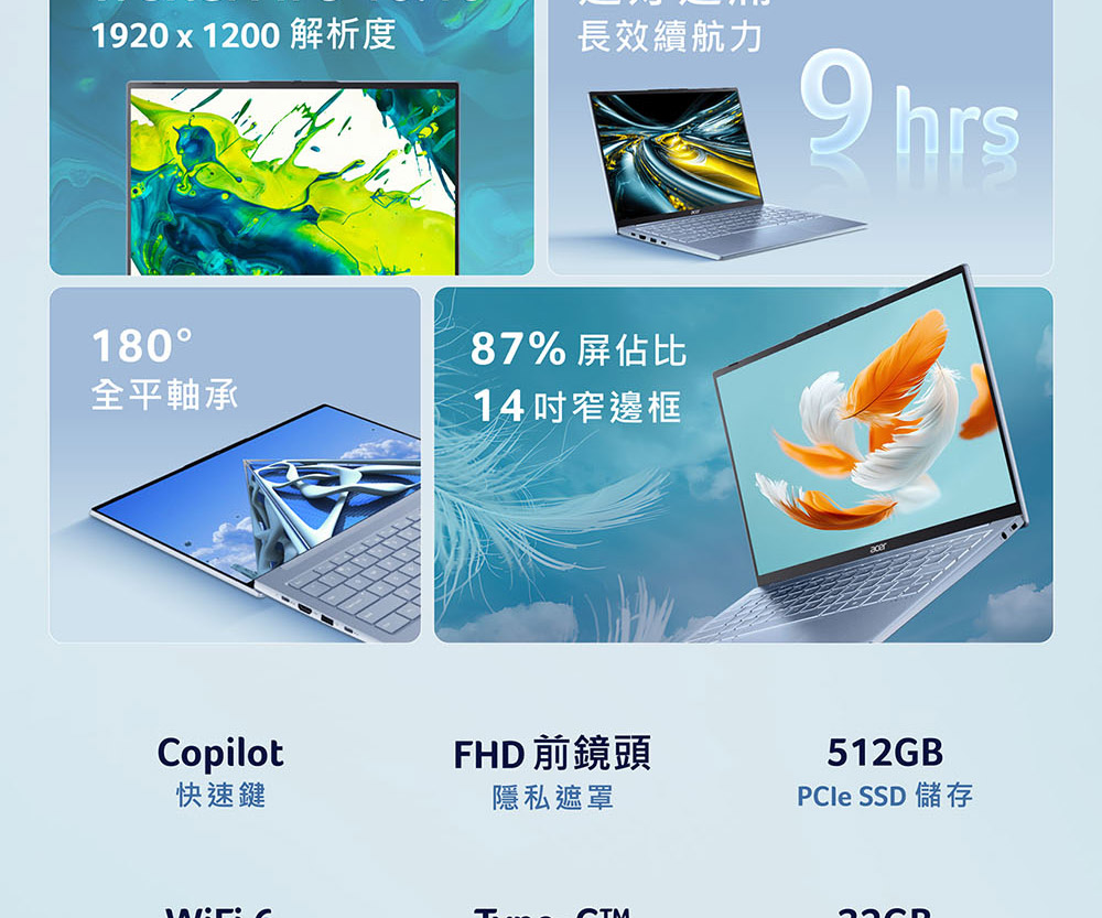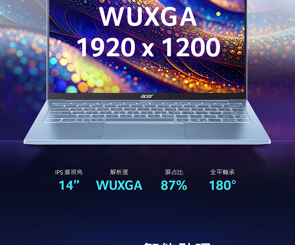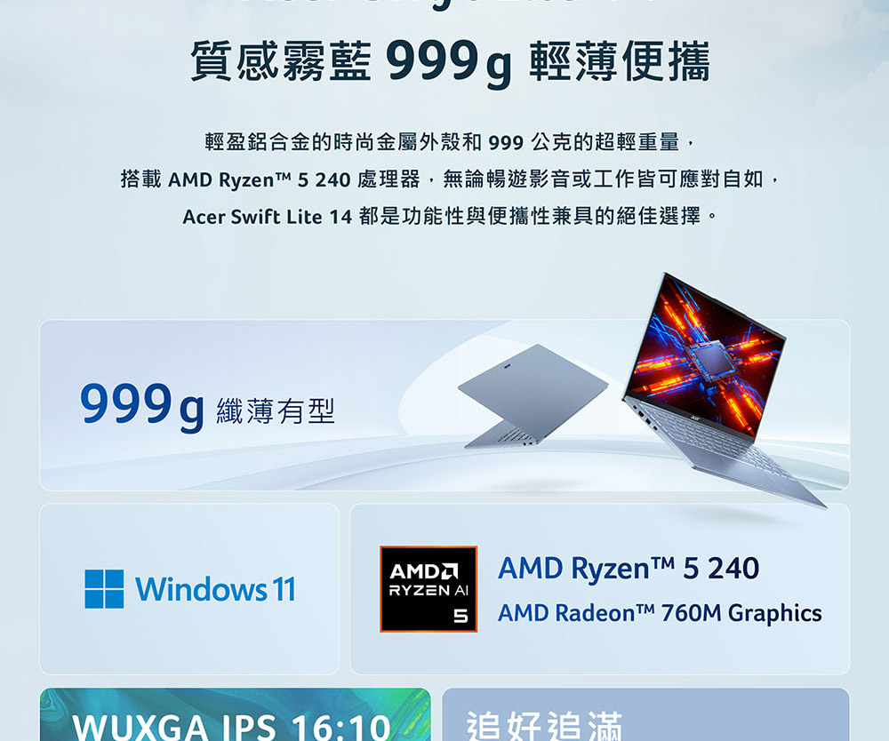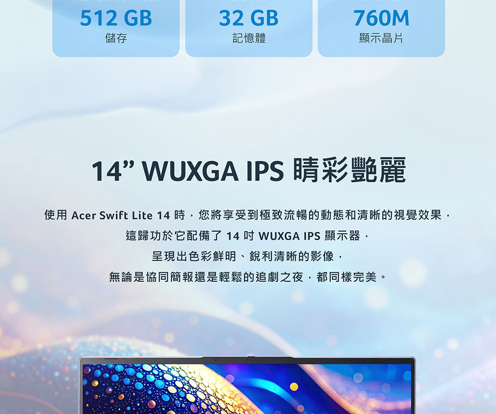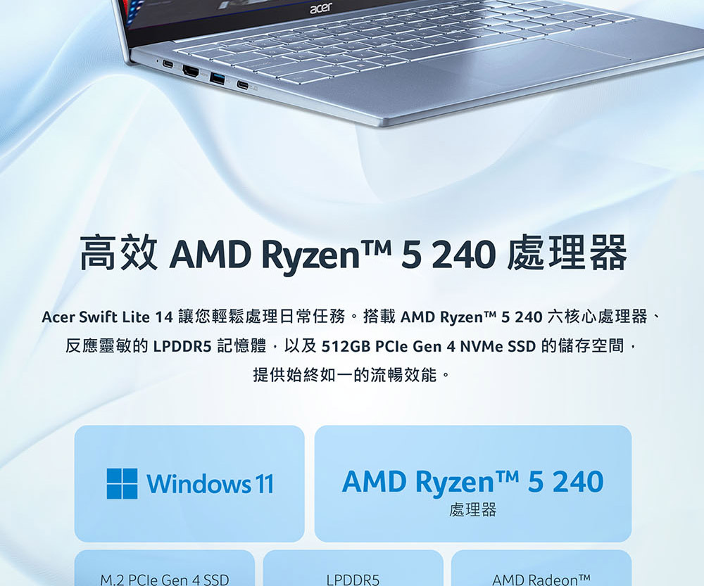 ACER Swift Lite系列:SFL14-41M-R1MR(藍) ( UN.DMWTA.001 ) 14" WUXGA1920x1200/IPS/16:10/霧面AMD Ryzen 5 24032GB LPDDR5(Onboard)/512GB PCIe GenWindows 11 Home/附鼠包 建達料號:NBACUNDMWTA001 原廠型號:UN.DMWTA.001 建議售價:$ 32,900 (含稅) 我要購買 商品介紹