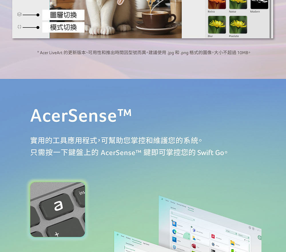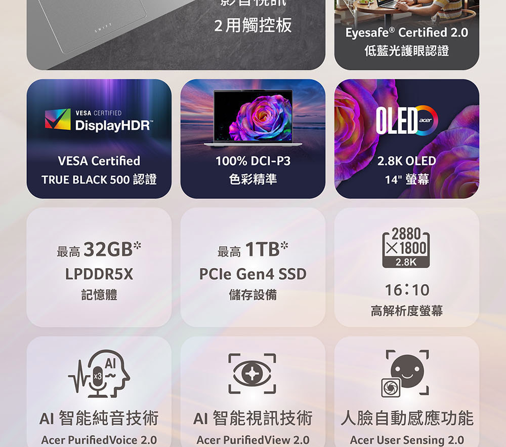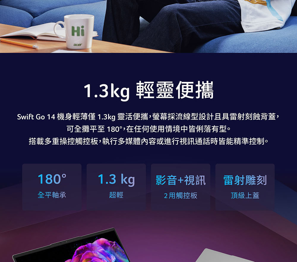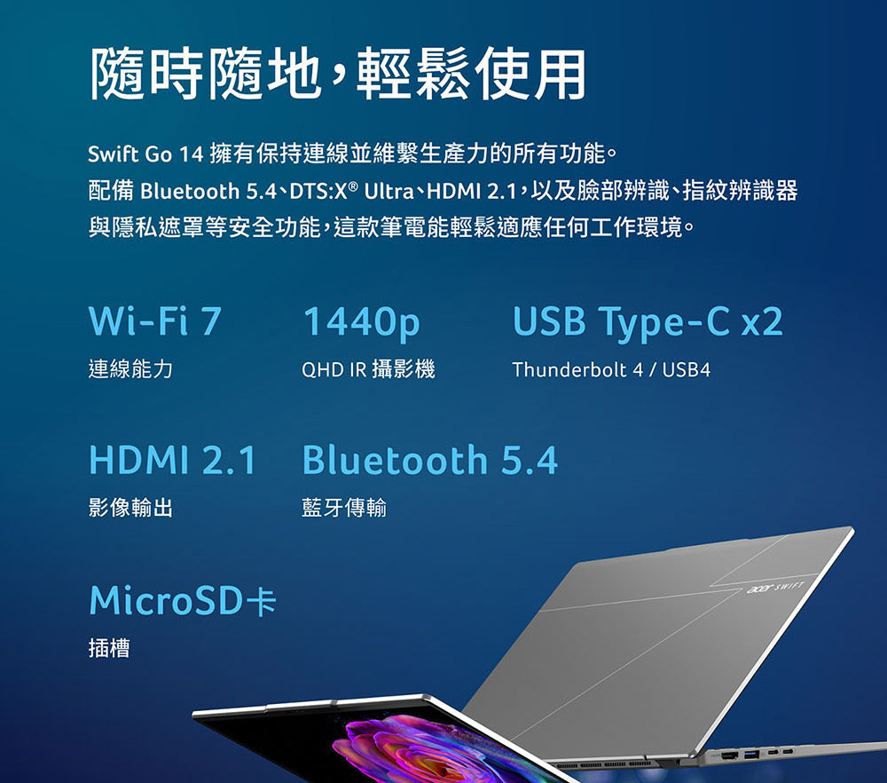 ACER Swift Go系列:SFG14-74-588E(銀) ( UN.JF8TA.005 ) 14" WUXGA 1920x1200/16:10/鏡面/OLEDIntel® Core™ Ultra 5 processor 225H16GB LPDDR5X(Onboard)/512GB PCIe GeWindows 11 Home/附鼠包 建達料號:NBACUNJF8TA005 原廠型號:UN.JF8TA.005 建議售價:$ 34,999 (含稅) 我要購買 商品介紹
